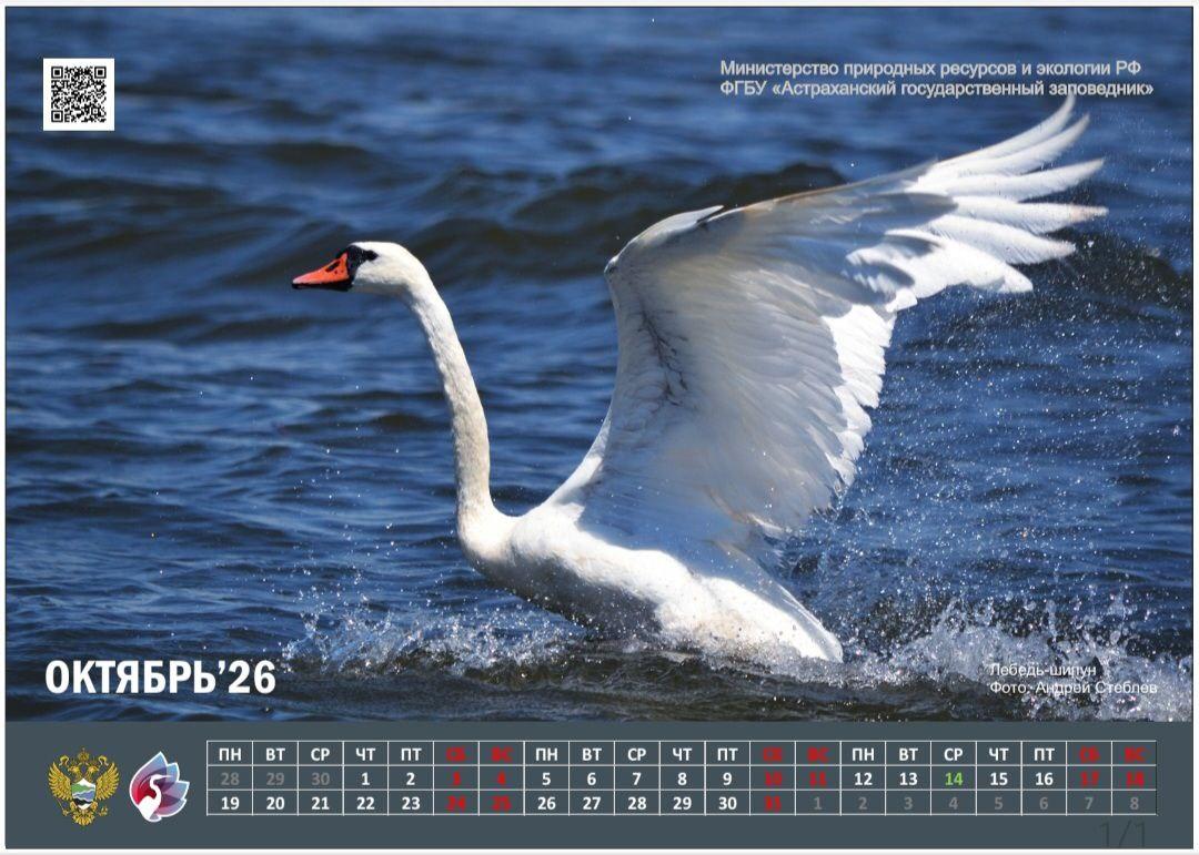 Кадр лебедя-шипуна, сделанный волгоградским фотографом Андреем Стеблевым, украсил страницу октября 2026 года в календаре Астраханского государственного заповедника.