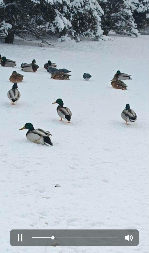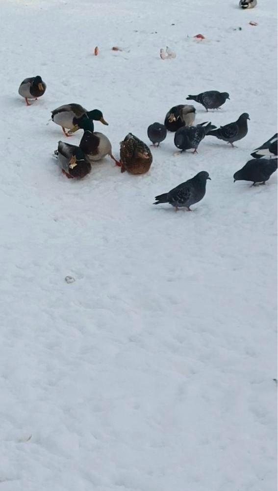 «SOS! Замерзают утки в парке на 8-й Воздушной Армии. Люди подкармливают их, но ведь очень холодно, они лежат на снегу, даже не встают, их очень много. Как помочь уточкам в такой холод? Им бы домики временные сделать или хотя бы сена под елки постелить», — написали читатели, приславшие снимки.