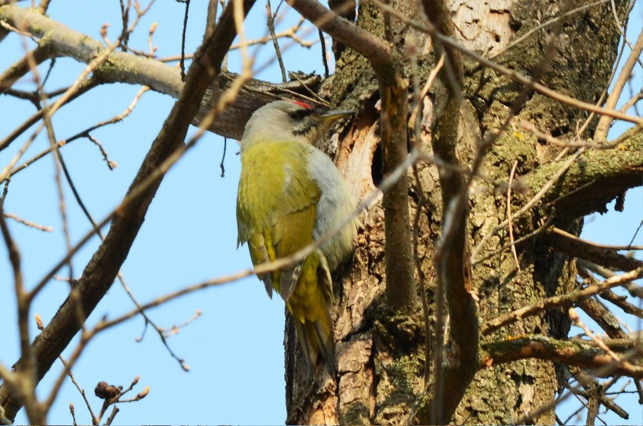 На снимке запечатлен самец седого дятла.