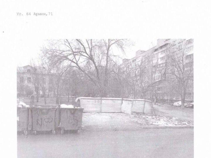 «Улица 64 Армии 71, 71/Д. Рядом находится здание МФЦ и магазин. Такая ситуация происходит на протяжении нескольких лет. Писали и в управляющую компанию, на „госуслуги“, отовсюду приходят отписки, что все хорошо и все убрано. Мусорные контейнеры стоят на дороге, объехать их невозможно, приходится выезжать на территорию парковки, хотя рядом детская площадка.» — сетует автор видео.