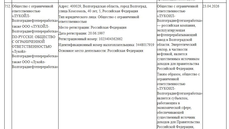 23 апреля 2026 года Евросоюз внёс дочернее предприятие «Лукойла» в Волгограде в обновлённый санкционный перечень.
