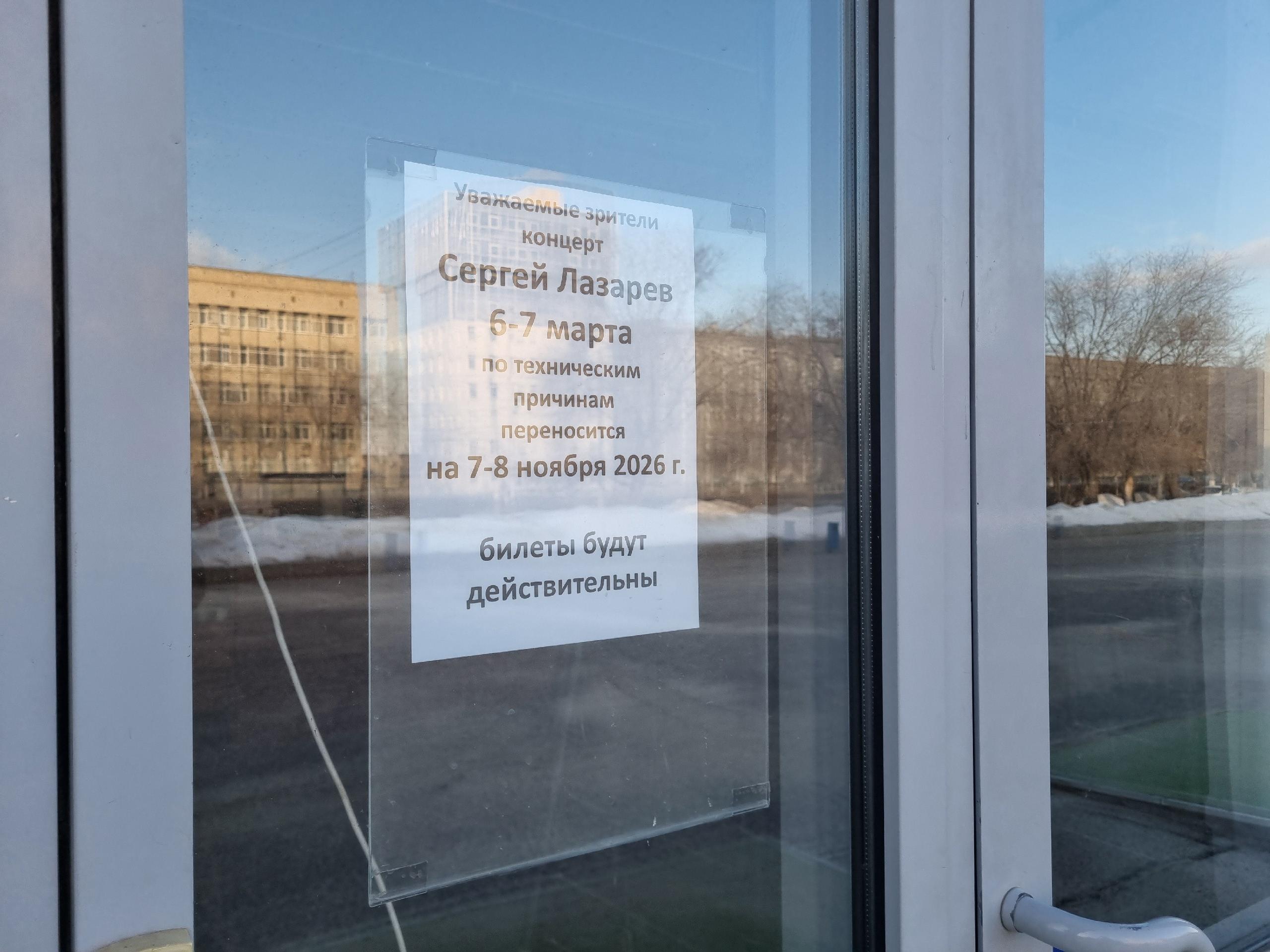 Авария случилась 5 марта во время монтажа и саундчека другой группы. В тот день в «Экспоцентре» должен был состояться концерт коллектива «Кипелов», который также был отменён и перенесён на 2 июня 2026 года. За день до своего выступления Лазарев заявил: «Сегодня утром пришла информация, что на площадке, где должен был пройти концерт, произошла авария, которая не позволяет провести концерт. Она произошла во время монтажа и саундчека другого коллектива, который должен был выступать сегодня, — говорил Сергей Лазарев. — Соответственно, сегодня у этого коллектива отмена. Нам сказали, что наш концерт тоже не состоится. Это ужасная информация, я не ожидал этого. Мы готовы ехать, уже вся команда там. Я понимаю, что многие из вас получили билеты в подарок к 8 Марта. Кто-то ехал из других городов. Я сам в шоке…»