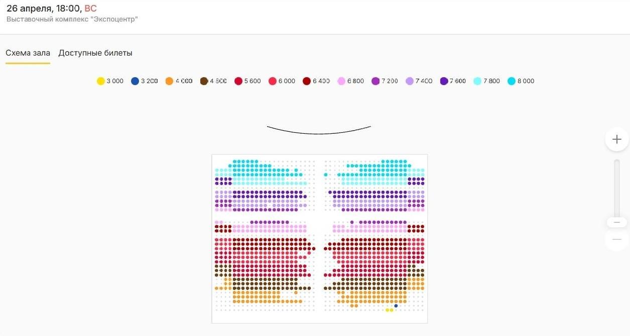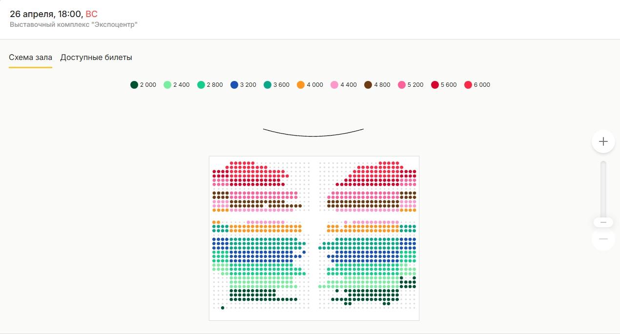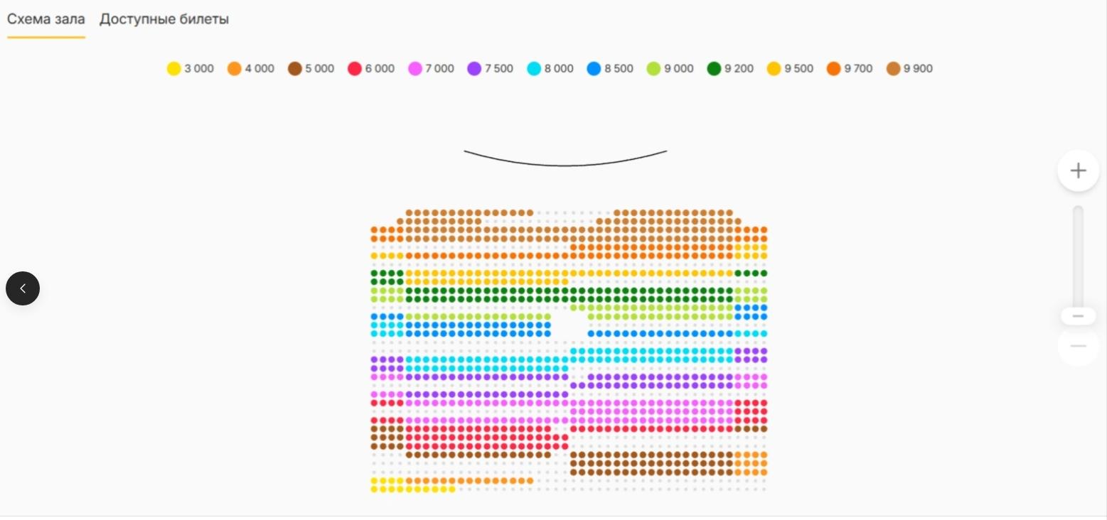 Теперь произошло второе снижение: самый бюджетный билет можно приобрести за 2000 рублей вместо прежних 3000, а самый дорогой — за 6000 рублей. Таким образом, максимальная цена уменьшилась почти вдвое по сравнению с первоначальной. Несмотря на это, зал заполнен менее чем на треть.