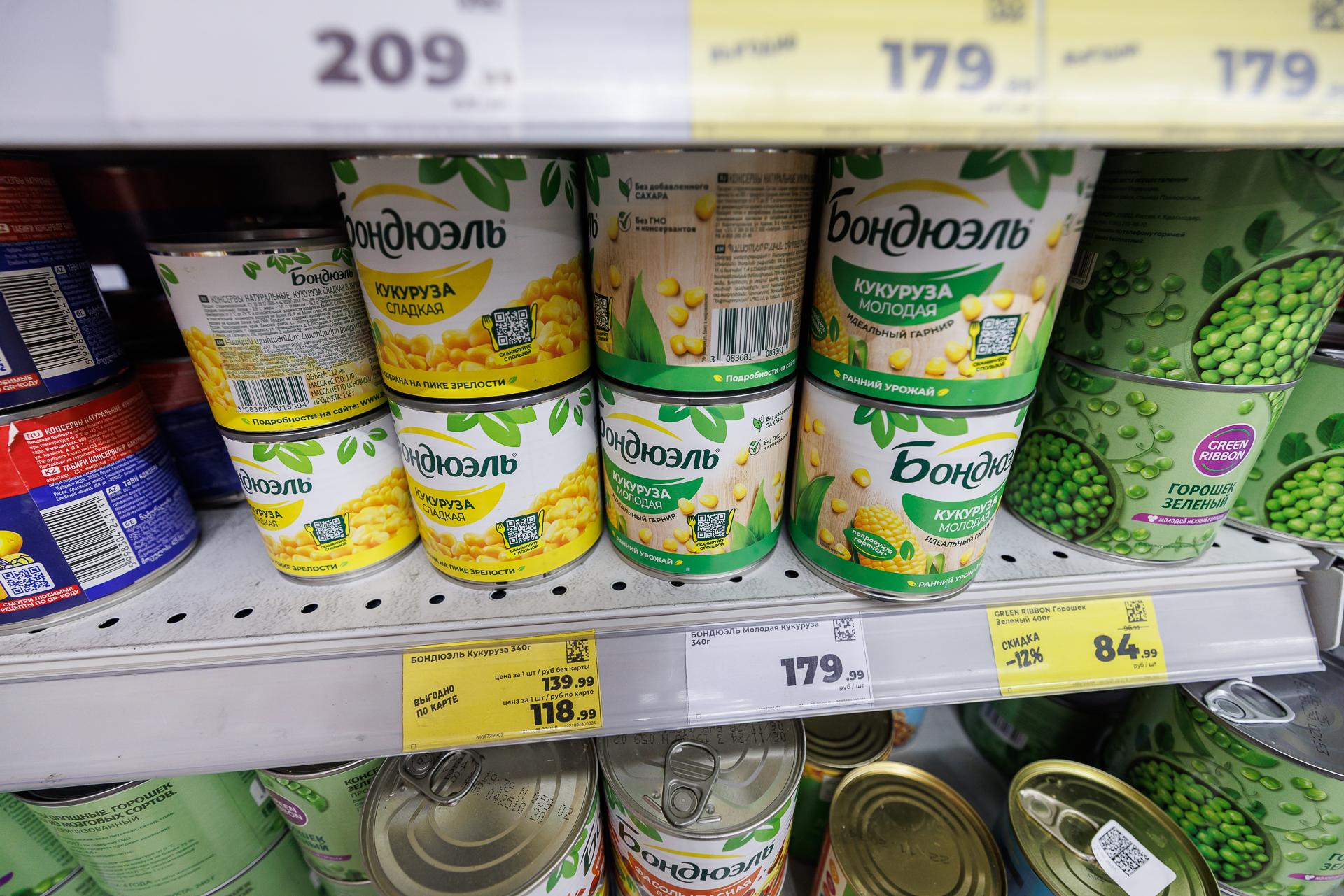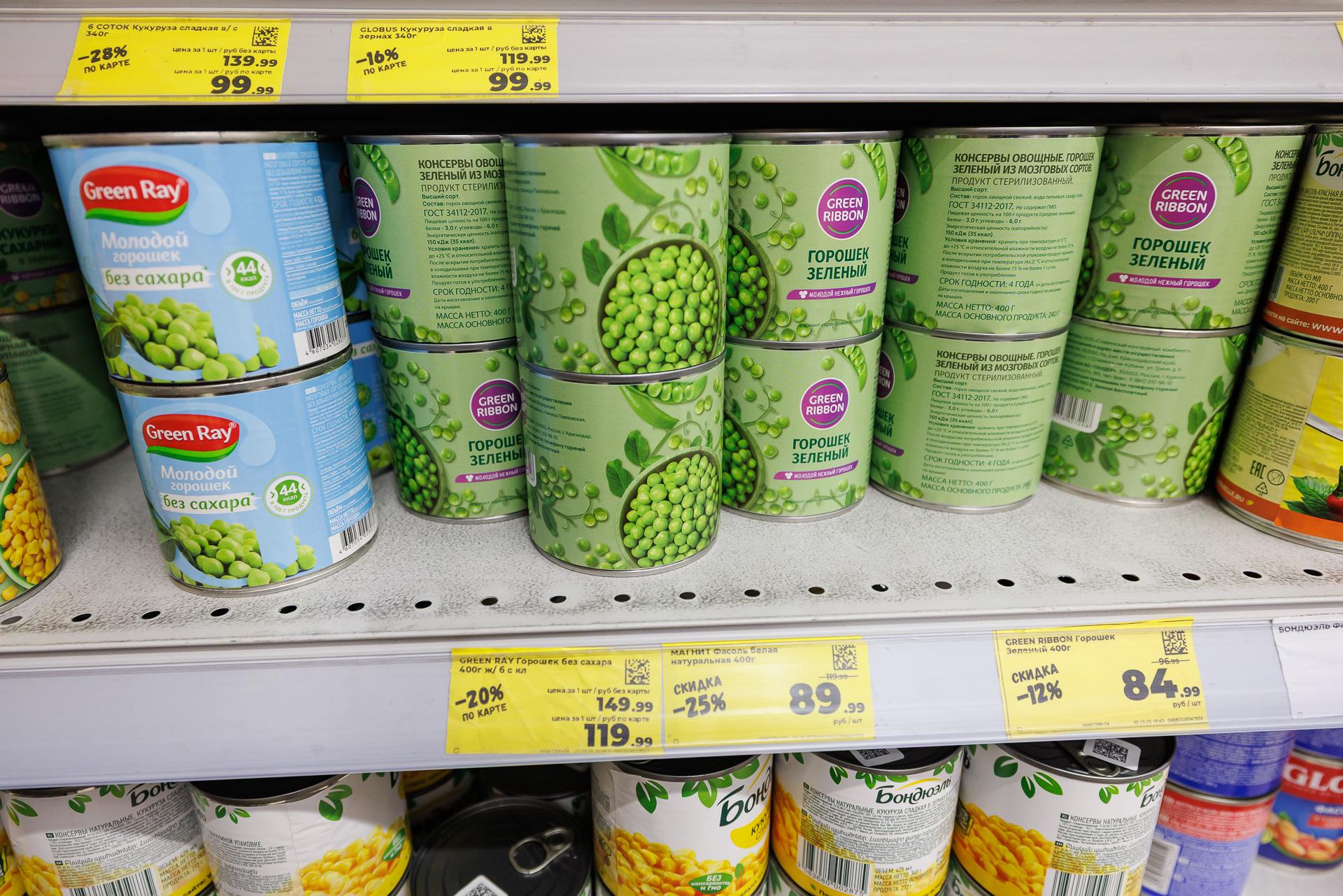 6. Отследить изменение цены на консервированный горошек оказалось сложно: той же марки продукта на полках не нашлось. В среднем его стоимость за полтора месяца осталась прежней.