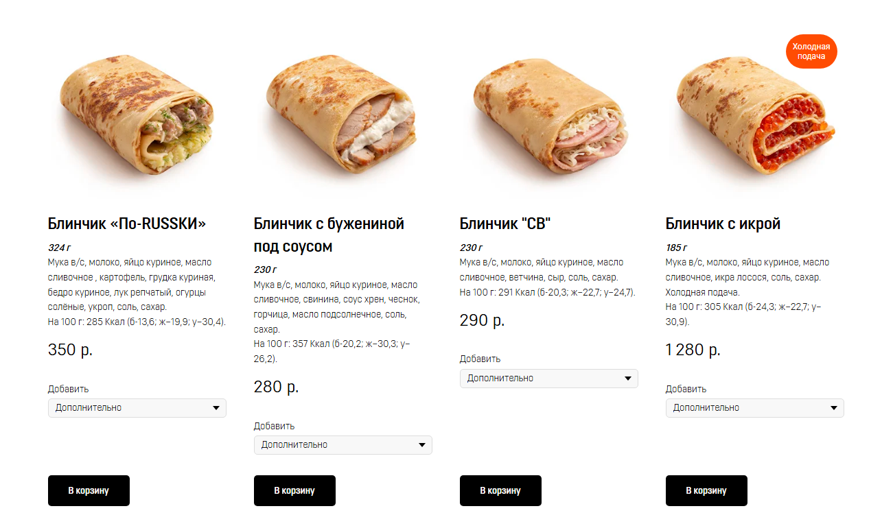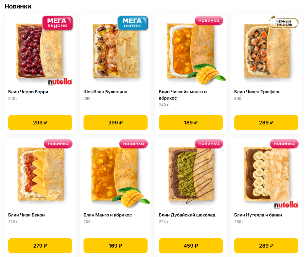 В «Блинбери» блин с маслом стоит 99 рублей. Самые дорогие варианты — «Дубайский шоколад» и «МЕГАпротеин» с мясными начинками. Собранный самостоятельно блин может стоить до 1566 рублей.