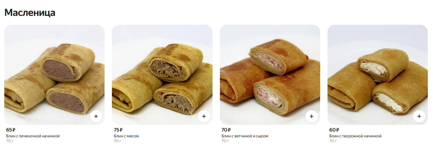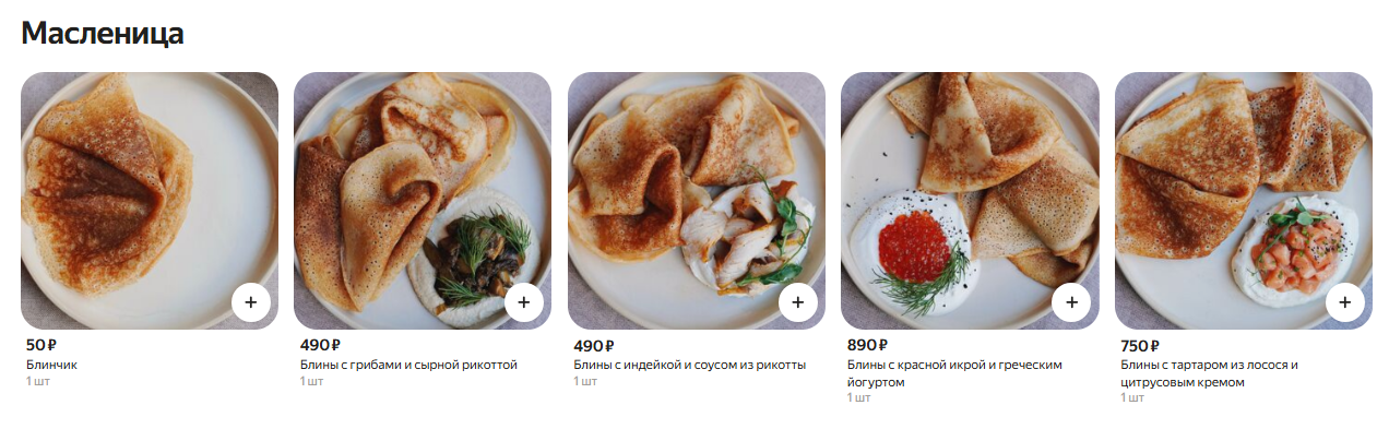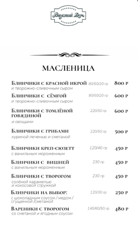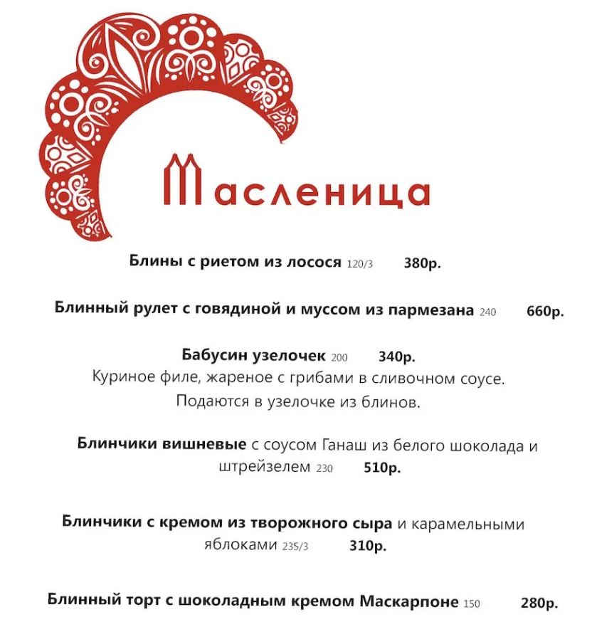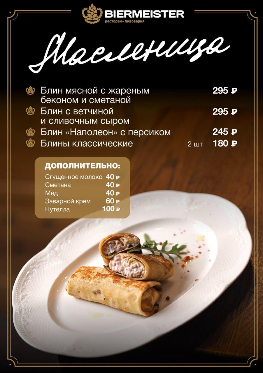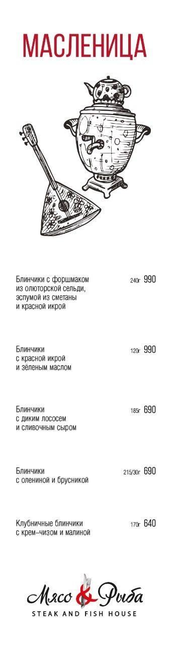 В ресторане «Мясо&Рыба» цены на блины выросли на 100 рублей по сравнению с прошлым годом. Блинчики с сельдью и икрой теперь стоят 990 рублей, с лососем или олениной — 690 рублей, а сладкие клубничные — 640 рублей.