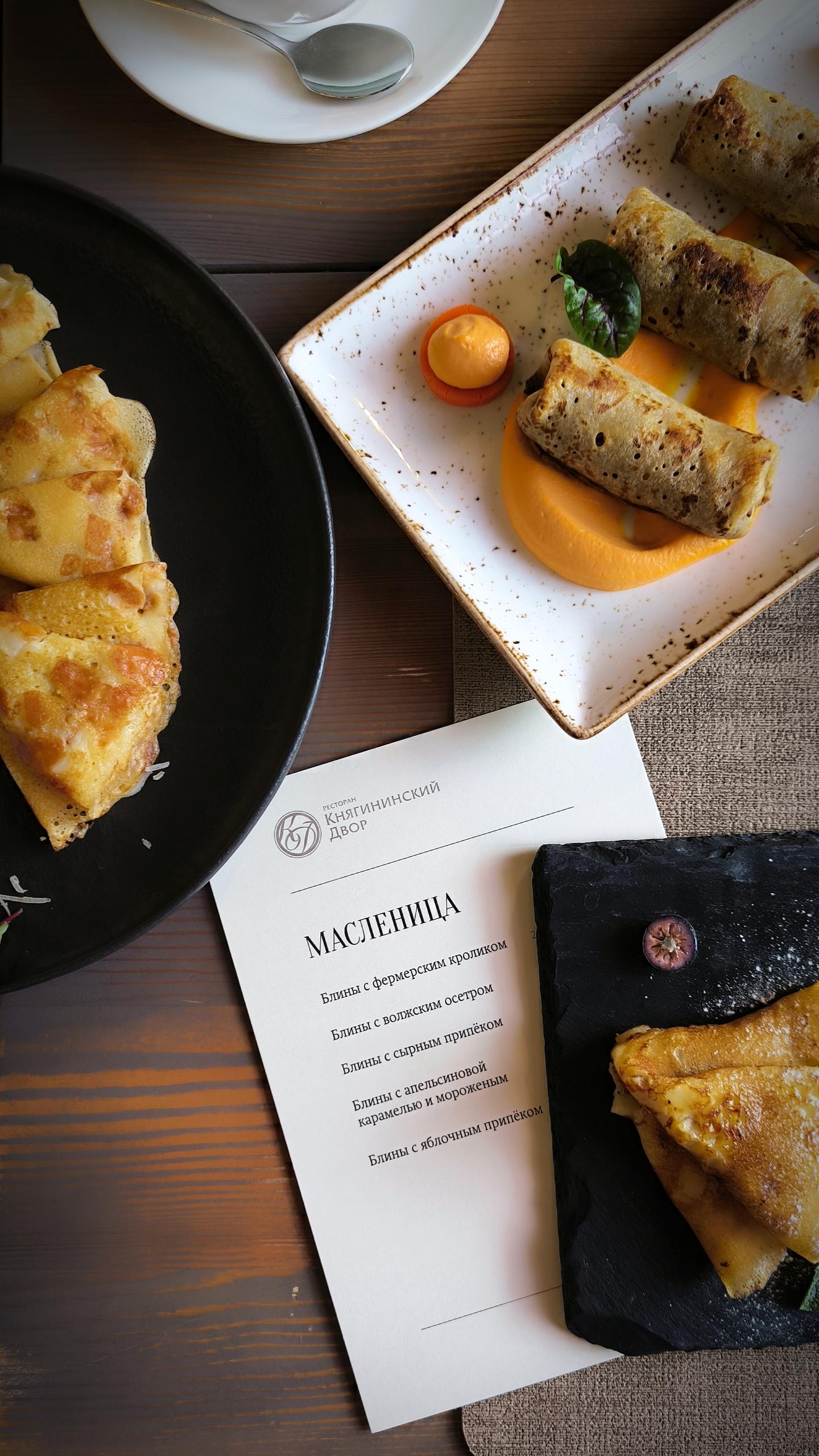 В прошлом году ресторан «Княгининский двор» предлагал сет из 20 ажурных блинчиков с намазками за 1490 рублей. Сейчас сета нет, но в меню есть блины с волжским осетром по 790 рублей за две штуки, с фермерским кроликом по 590 рублей за три и с апельсиновой карамелью по 490 рублей за три.