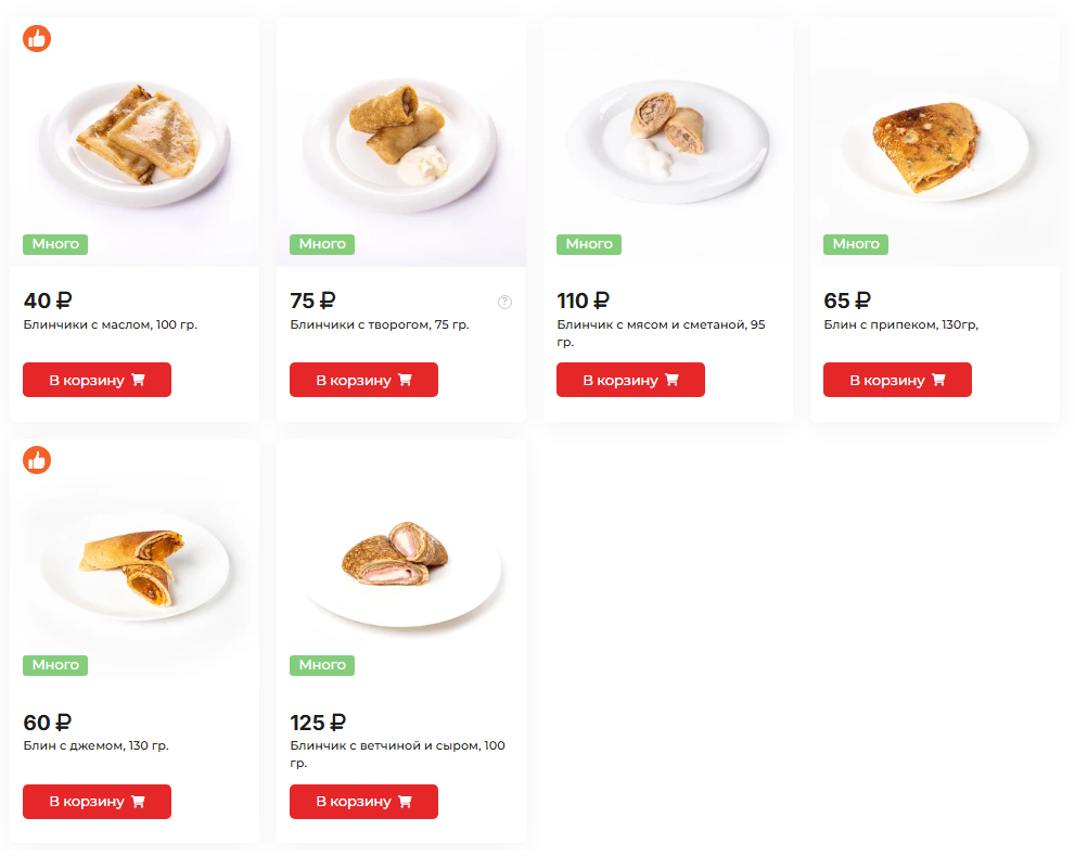 В прошлом году в «Хлебнице» продавали самый дешевый блин за 29 рублей, но сейчас его нет. Сейчас там блин с творогом стоит 60 рублей, а мясной — 75 рублей.