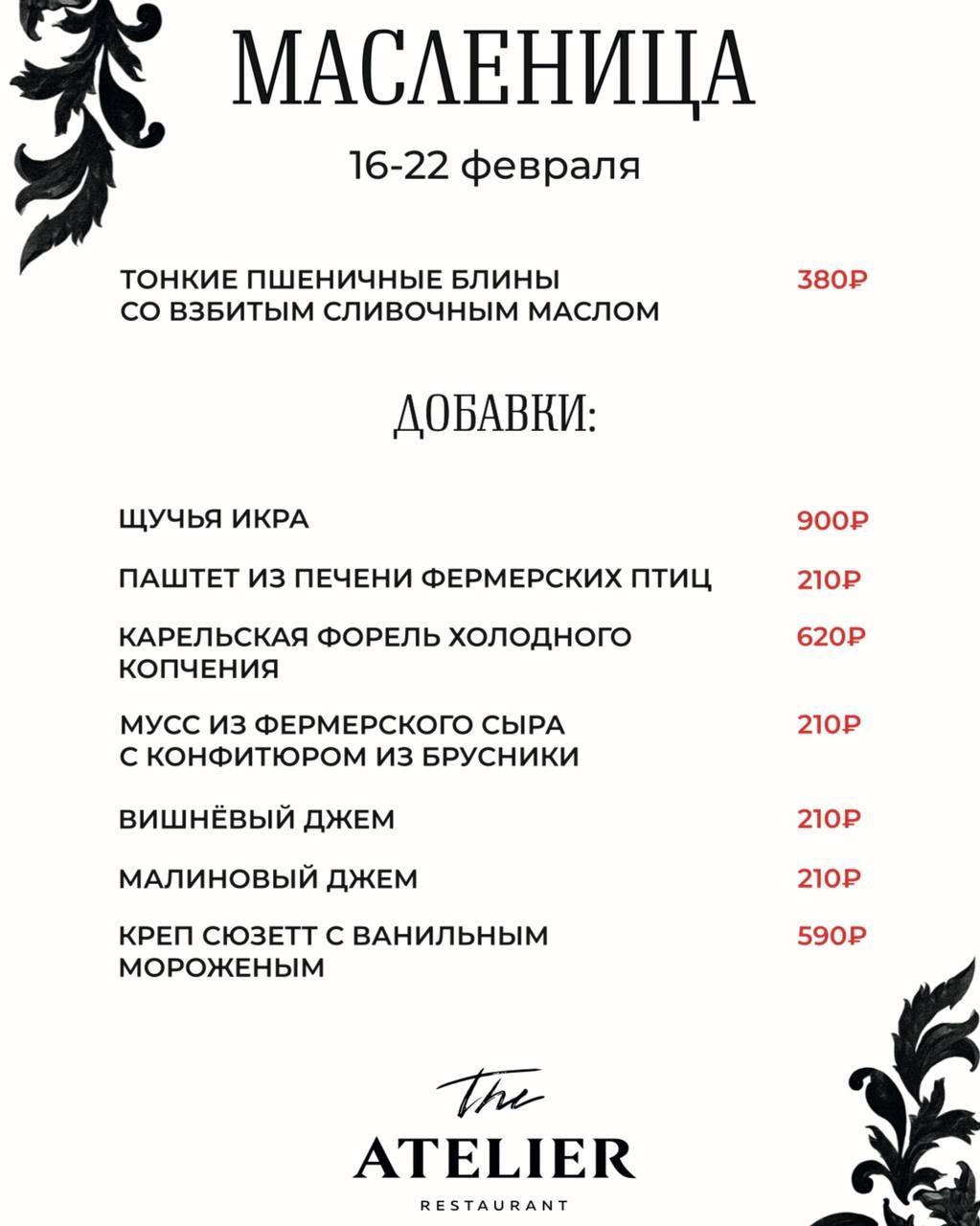The Atelier предлагает тонкие пшеничные блины со взбитым маслом за 380 рублей. К ним можно добавить щучью икру за 900 рублей, карельскую форель за 620 рублей или креп сюзетт за 590 рублей. Паштеты и джемы обойдутся в 210 рублей.