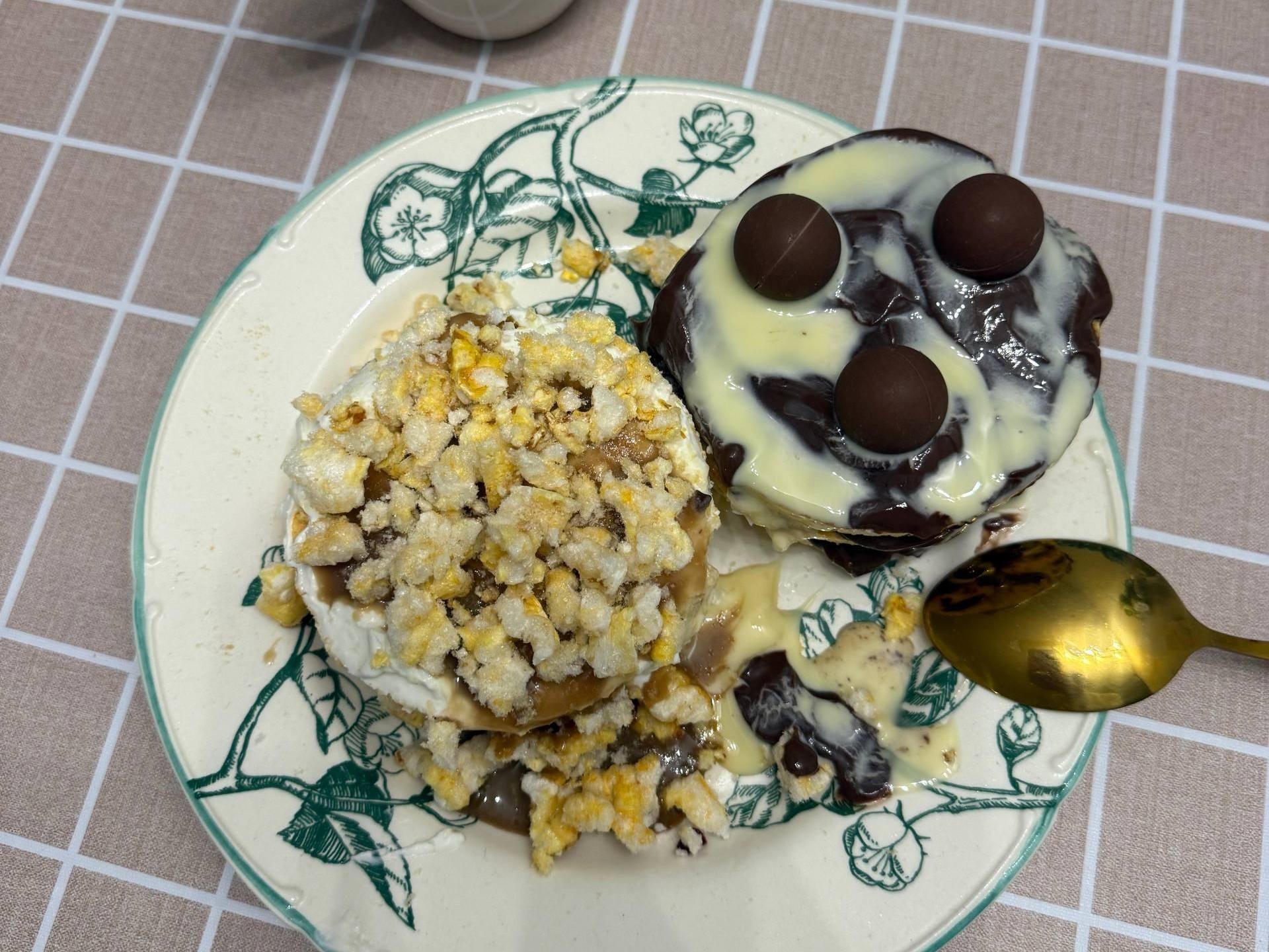 Аналогичным способом можно приготовить карамельно-шоколадный вариант, используя сгущенку и пудинг. Рецепт позволяет варьировать начинку по своему вкусу. Главный секрет быстрого приготовления — хлебцы, которые избавляют от необходимости делать коржи с нуля.