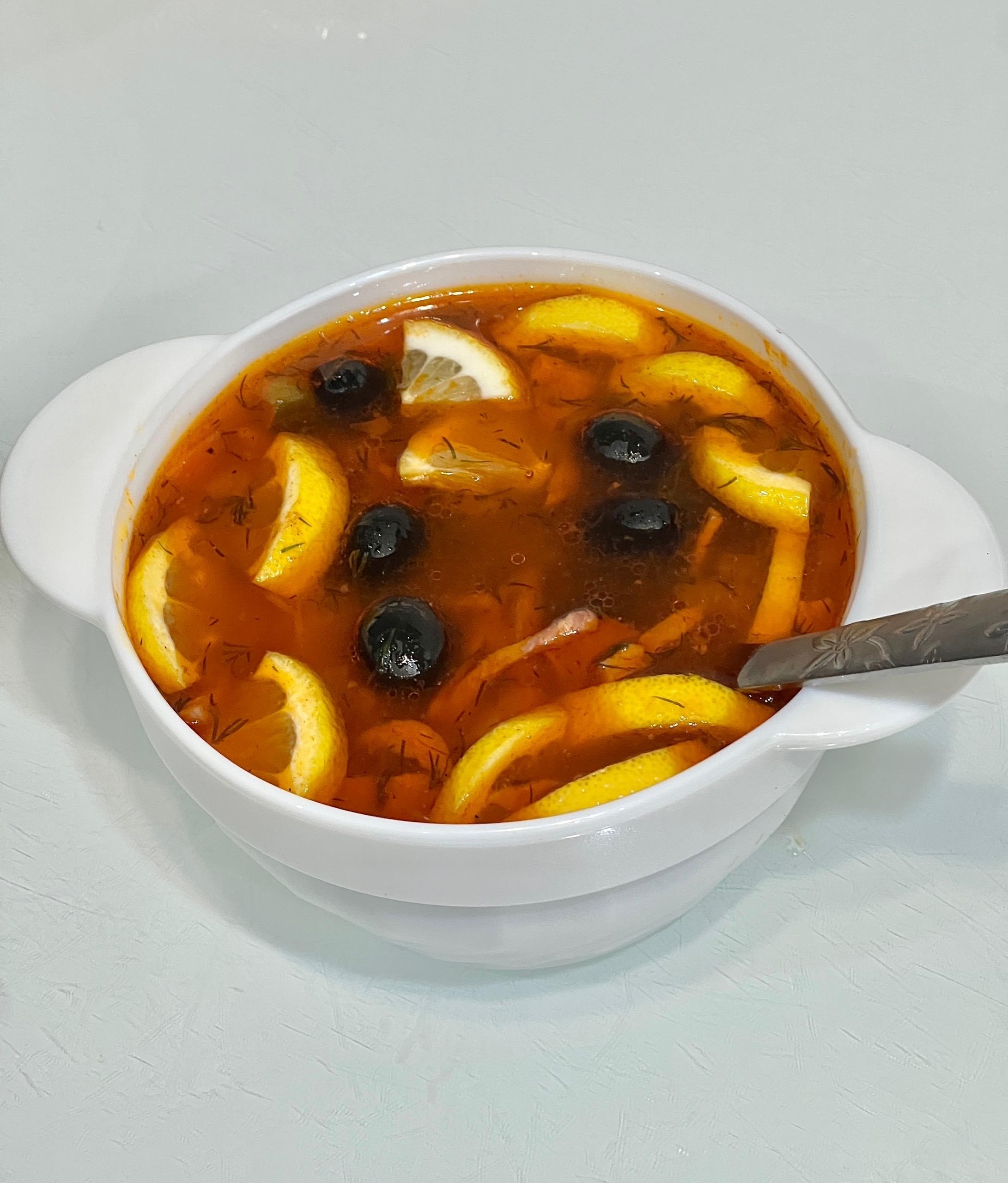 На этом этапе суп уже готов. Однако для тех, кто предпочитает более пикантный вкус, Александр рекомендует добавить черный перец, несколько капель острого соуса, около десяти маслин и пару ломтиков лимона. Завершающим штрихом может стать ложка сметаны, положенная непосредственно в тарелку.