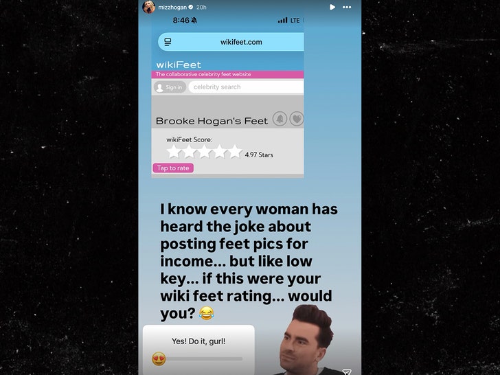 По всей видимости, Брук серьёзно рассматривает эту возможность. Она зашла на сайт wikiFEET, где оценивают ступни знаменитостей, и обнаружила, что её ноги получили оценку 4.97 из 5.