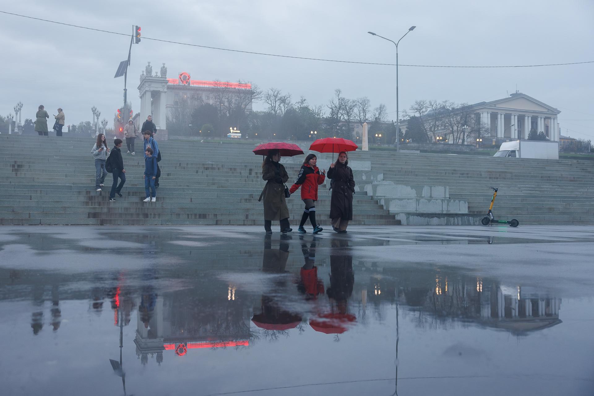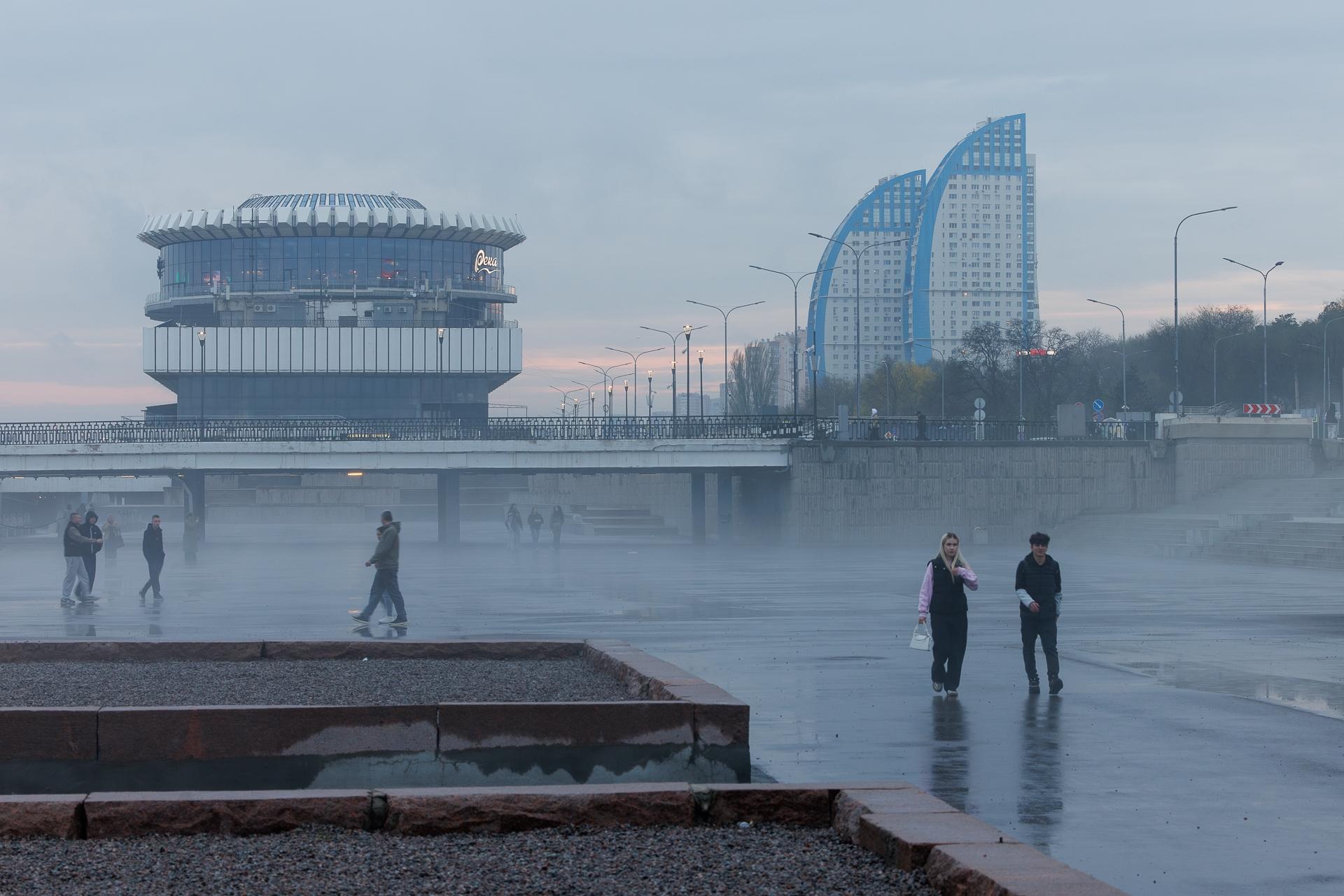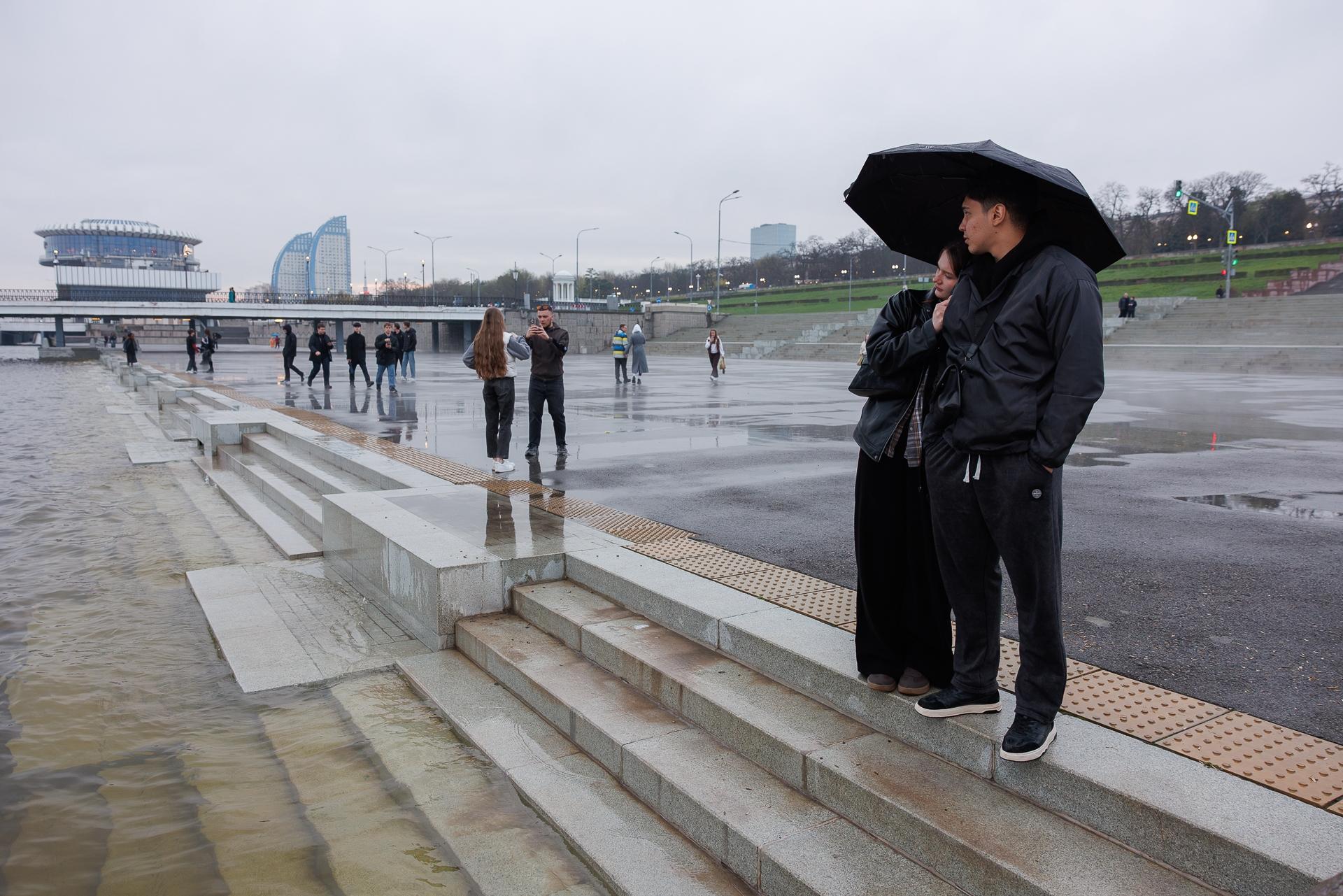Нижняя терраса центральной набережной Волгограда оказалась под водой после увеличения сброса через плотину Волжской ГЭС. Несмотря на дождь, тучи и туман, это привлекло множество жителей, собравшихся наблюдать за необычным зрелищем.