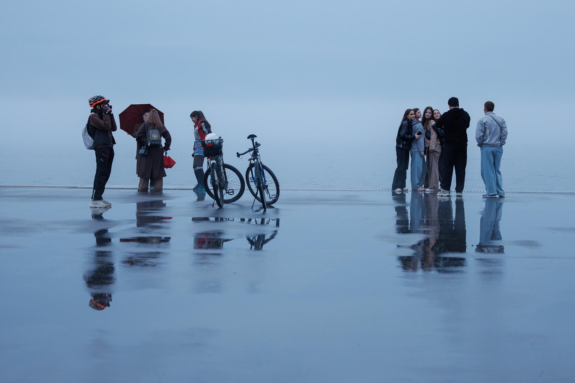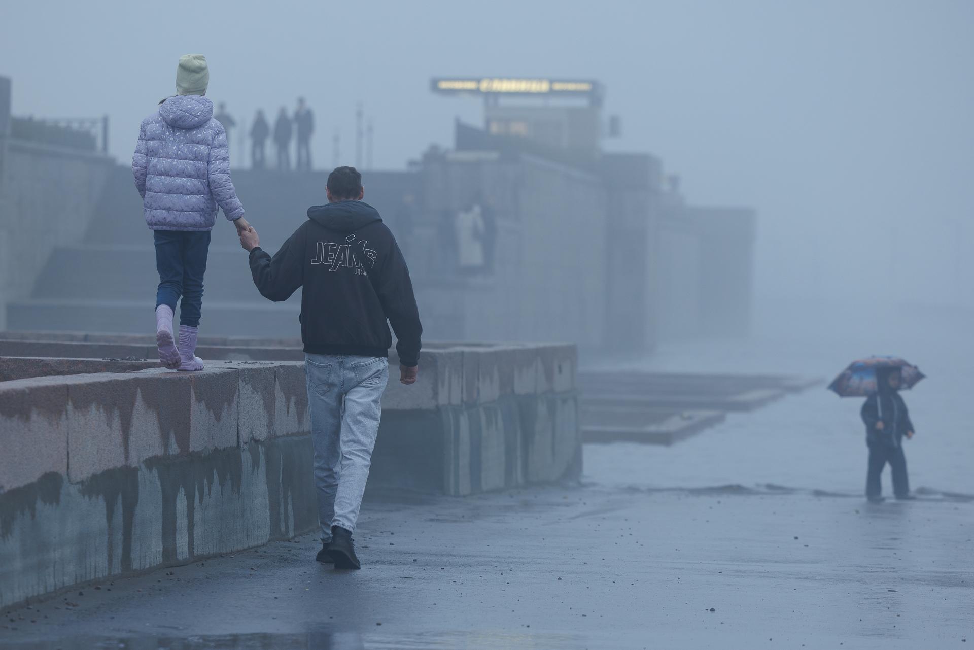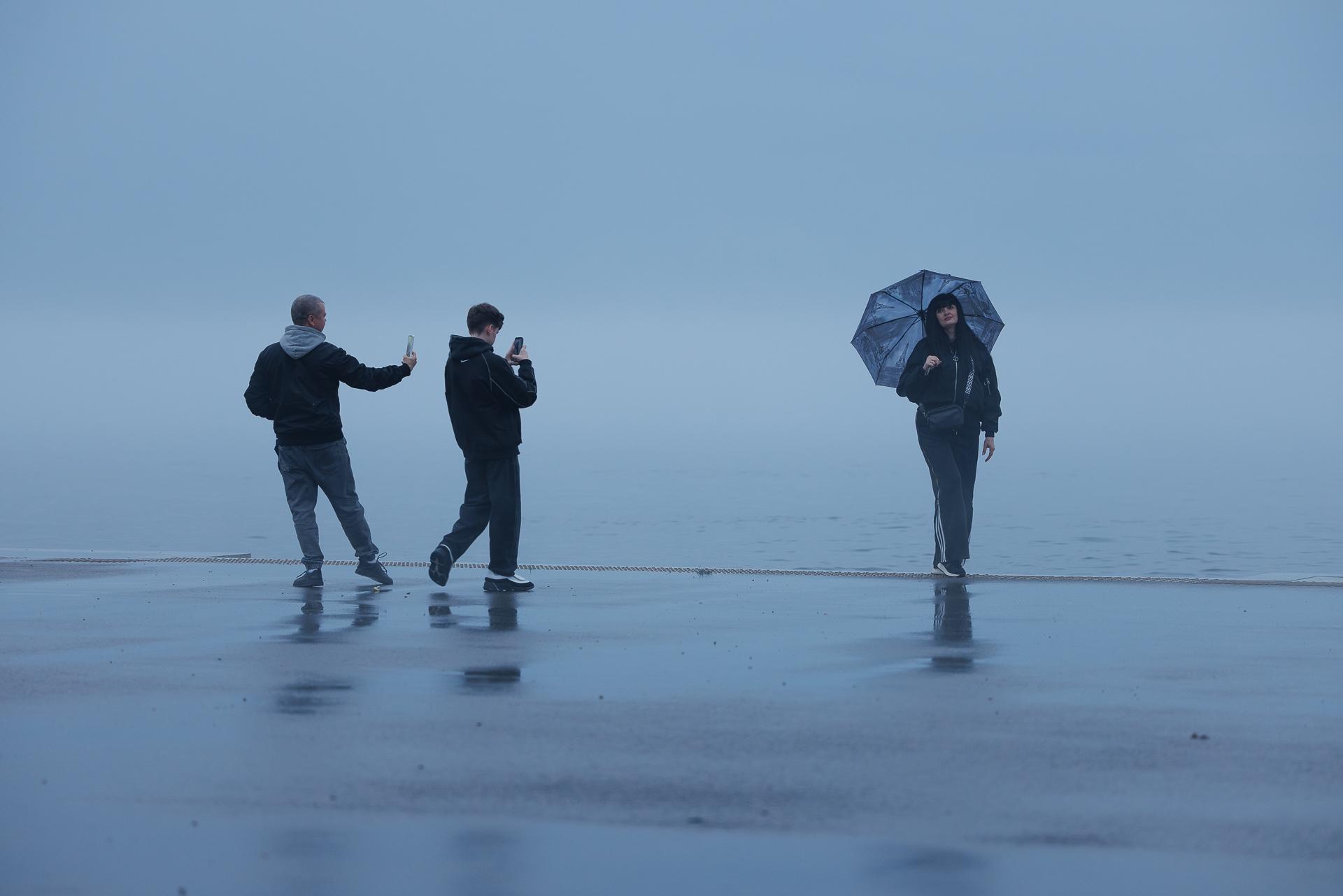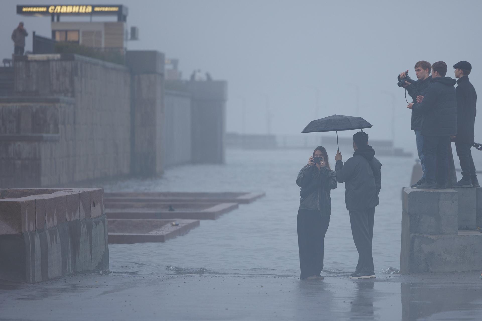 Несмотря на плохую погоду, на набережной собралось много людей.