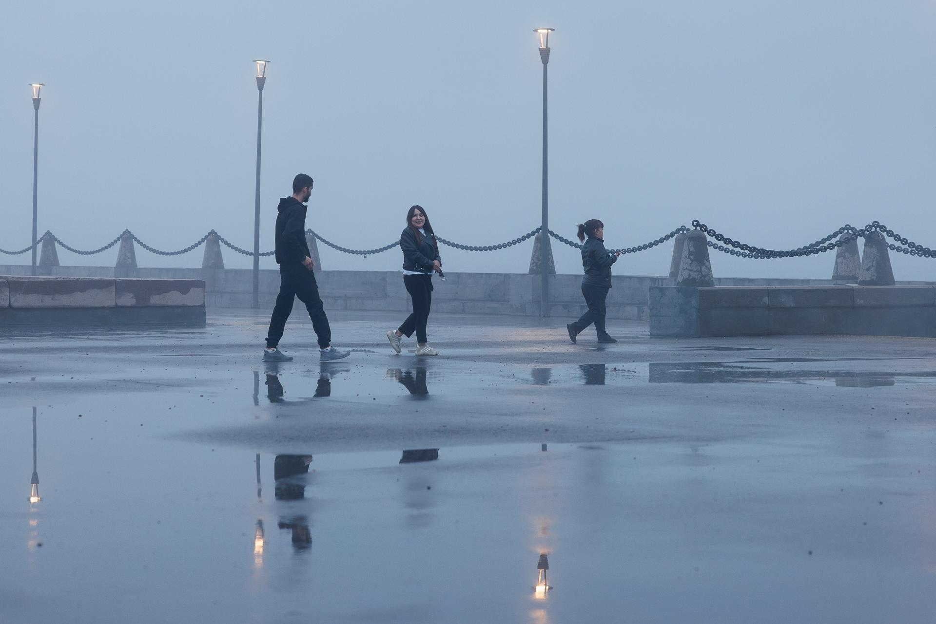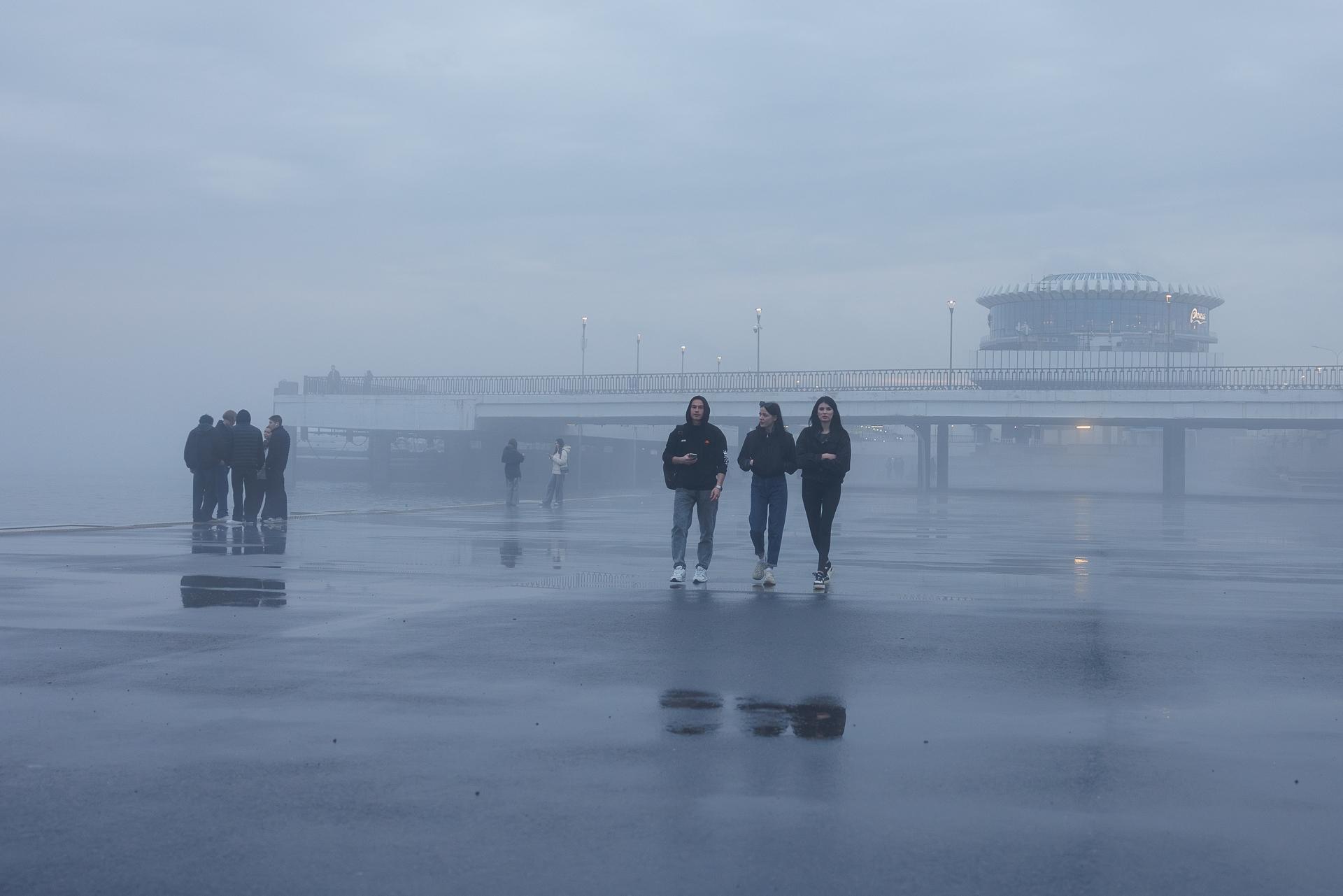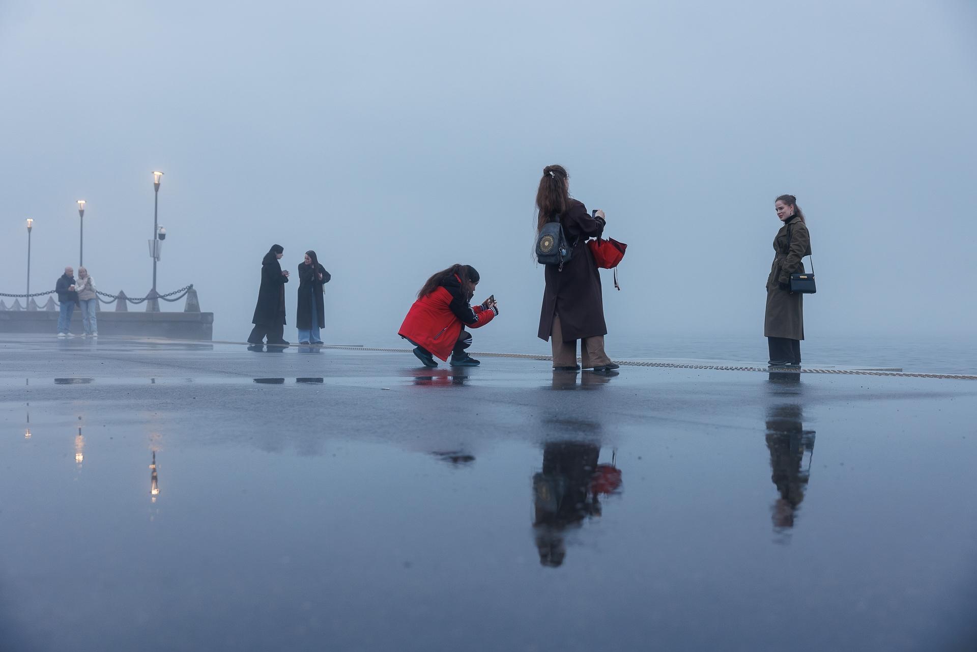 Несмотря на плохую погоду, на набережной собралось много людей.