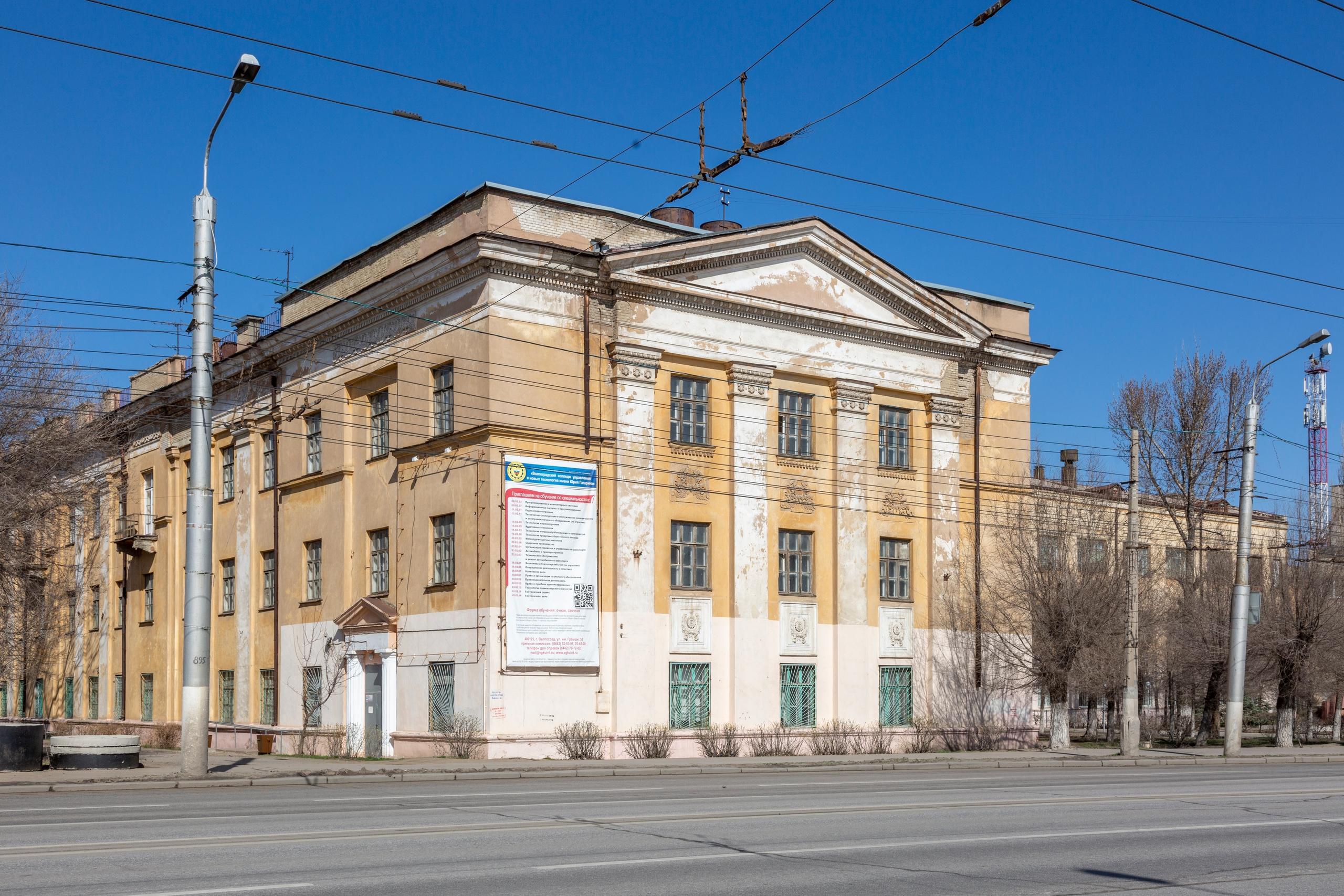 Здание было построено в 1932 году как школа фабрично-заводского училища для подготовки кадров тракторного завода. После реконструкции в 1948 году здесь в 1950 году основали Сталинградский вечерний машиностроительный техникум.