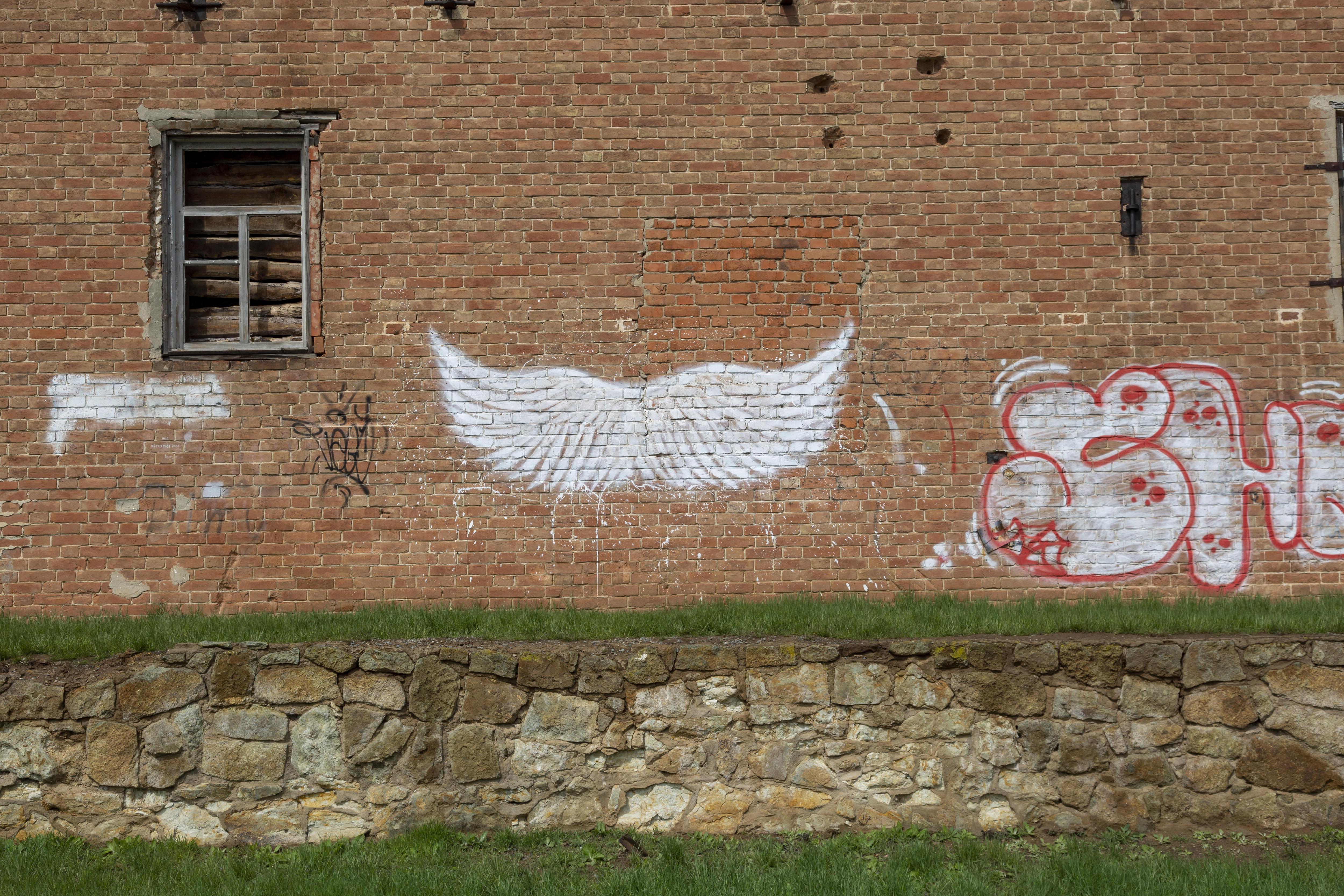 Граффити в виде «крыльев» на стене здания, за которое несколько лет назад критиковали блогера, до сих пор не стёрто.