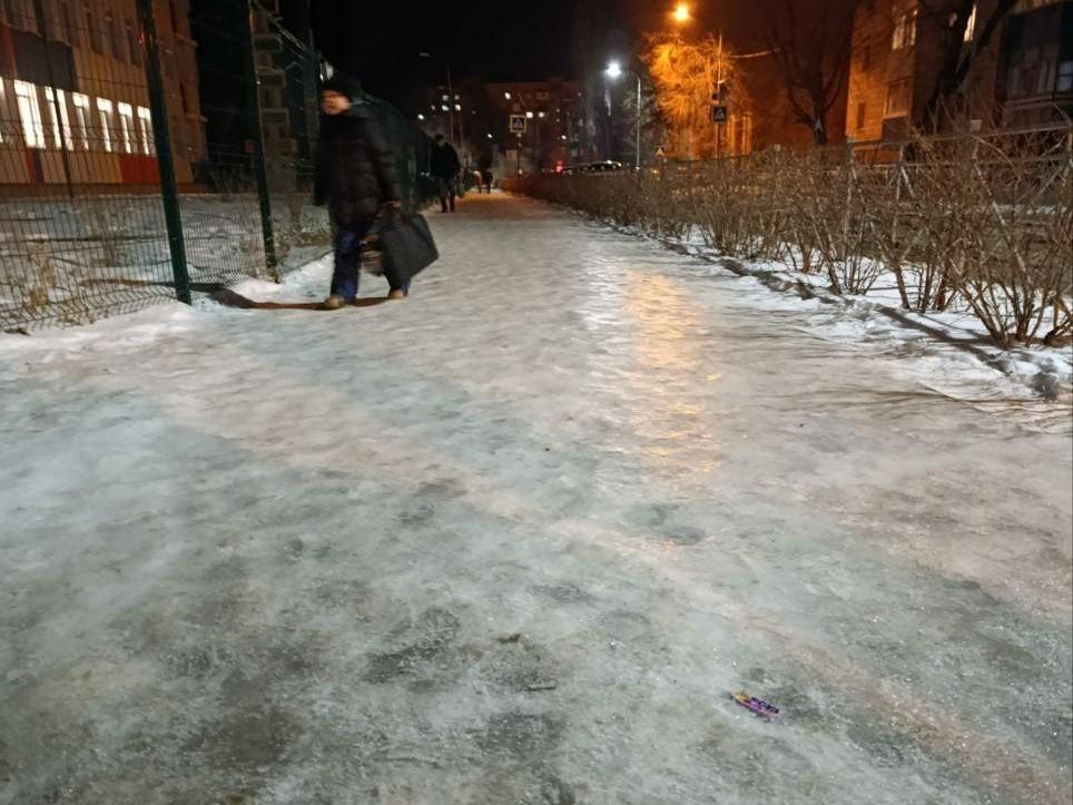 Подобные инциденты в городе не единичны. На скользкие тротуары возле учебных заведений также жаловались родители учеников школ: