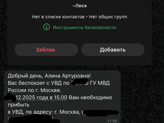 «Изначально я подумала, что это написали хейтеры или военные по просьбе моего мужа. Ранее такие ситуации со мной уже случались. Я была сначала в шоке. Но потом до меня стали доходить разумные мысли. Спойлер: это мошенники, — рассказывает девушка. — Они знают мое имя и фамилию, знают мой телеграм-канал. Но официальные органы, сотрудники — никто вас не будет приглашать на прием через мессенджеры. Вы можете потом через какое-то время общаться с ними по телефону, чтобы документы перекинуть или еще что-то. Но приглашать вас на беседу, как они написали… Это даже не сленг сотрудников. Вам придет официальное приглашение только через Госуслуги, либо вам придет повестка, которую вы должны подписать. Даже если вам написали — человек должен представиться, кто он, что он. Мошенники сразу посыпались, никаких данных у них нет».