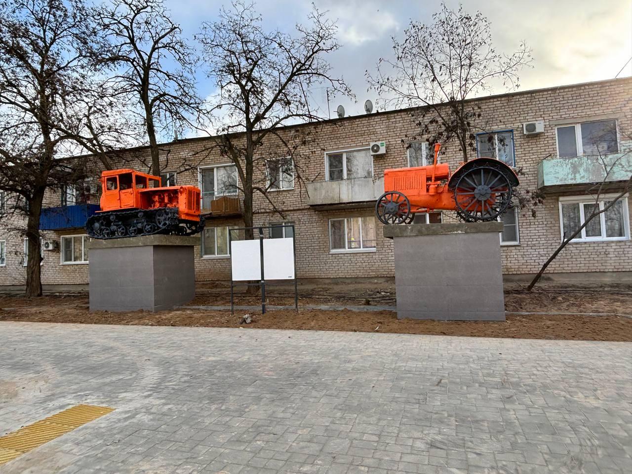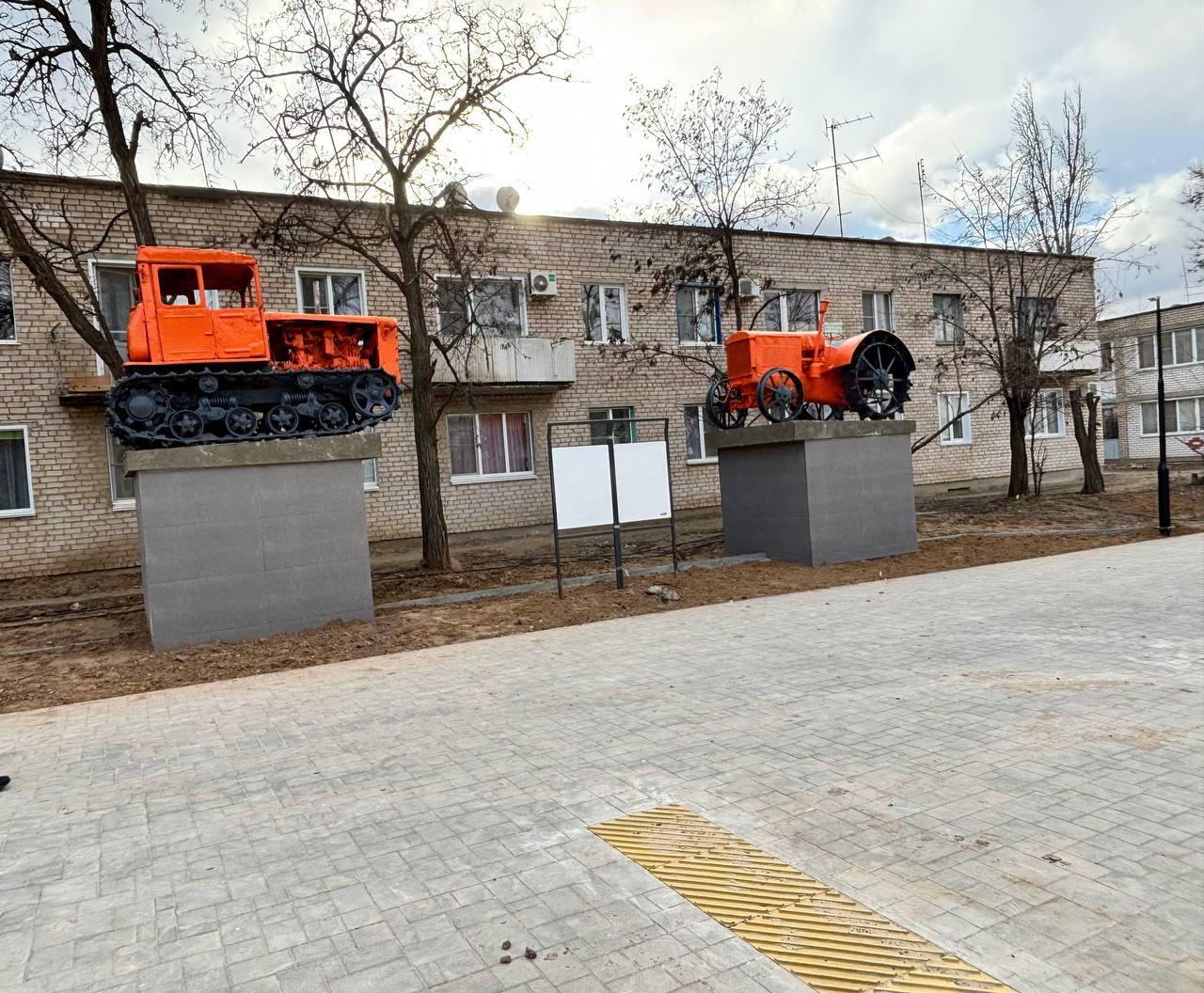 В Ленинске Волгоградской области вновь появились памятники тракторам, однако теперь они расположены на новом месте и окрашены в яркий цвет. Отреставрированные гусеничный и колесный тракторы установлены на постаментах перед зданием агропромышленного техникума.