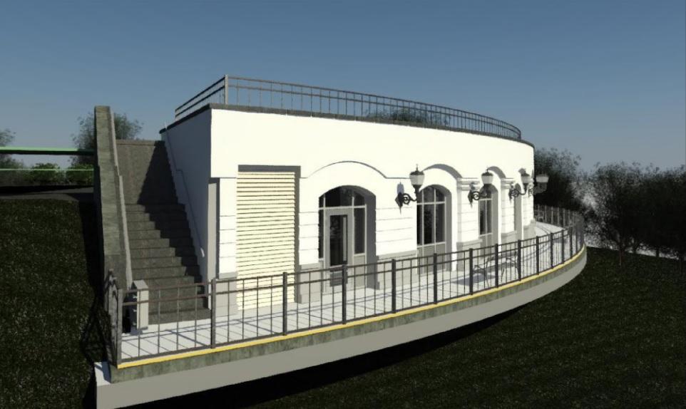 Сооружение запланировано полукруглой формы с огороженной площадкой со стороны откоса и окнами, выходящими на овраг. Вдоль торцов предусмотрены две лестницы для связи с террасой у храма. Общая площадь здания составит 205,5 квадратных метров, а внутренние помещения займут 186,81 квадратных метров. Внутри разместят:
