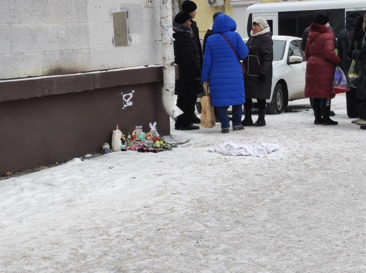 Корреспондент Денис Гусаков сообщает: «Родственники потихоньку собираются. Человек 20-30 уже пришло. На месте — стихийный мемориал из цветов, игрушек. Рядом лежит та самая окровавленная простынка… Приходят как родственники, так и совершенно незнакомые люди для семьи. Пришла родственница одной из девочек, которая вместе с подружкой выпала с 16-го этажа в Кировском районе, просто поддержать. С собой приносят мягкие игрушки. Один мужчина принес огромного плюшевого медведя».