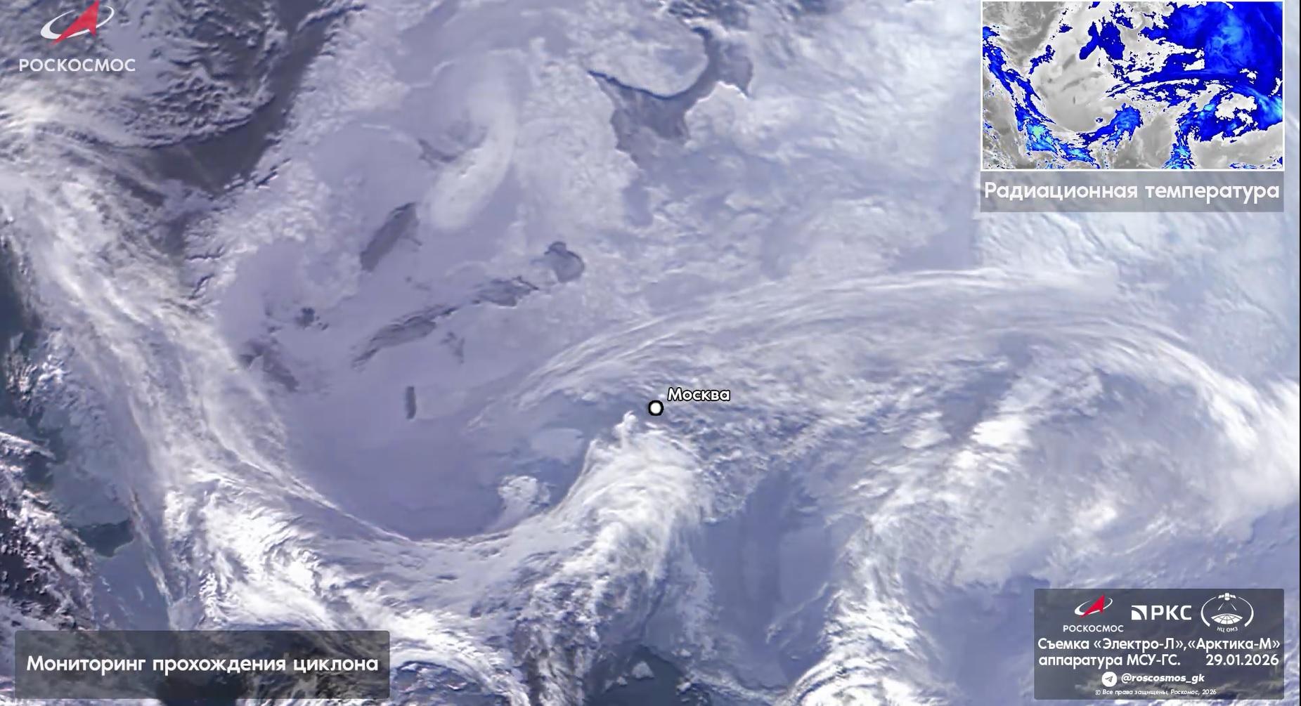 В своем телеграм-канале Роскосмос опубликовал минутное видео, на котором запечатлен огромный циклон. Атмосферный вихрь, снятый с высоты 40 тысяч километров, стал причиной снегопадов в столице и необычного для января потепления в Волгоградской области.