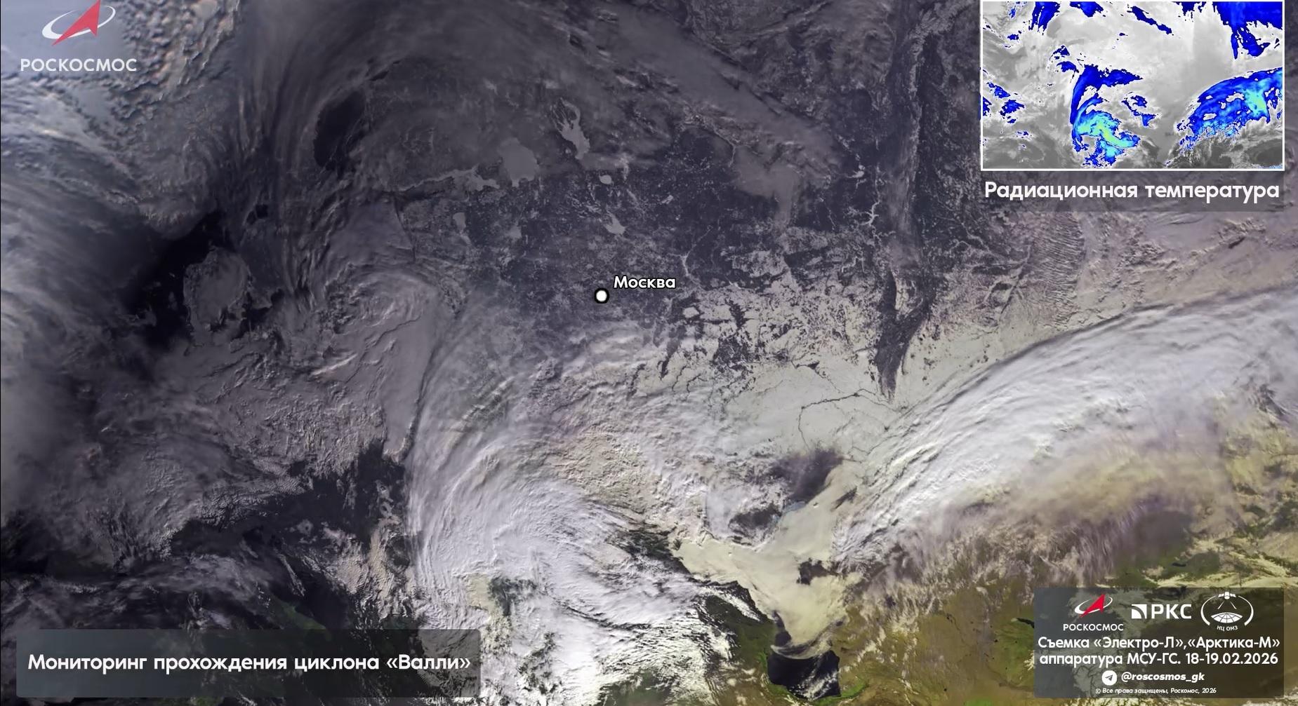 Госкорпорация Роскосмос обнародовала видеозапись циклона «Валли», сделанную с орбитальных аппаратов. Этот атмосферный вихрь вызвал сильные снегопады в Москве и затронул Волгоград. Съемки вели спутники «Электро-Л» и «Арктика-М», находящиеся на высотах до 40 тысяч километров.
