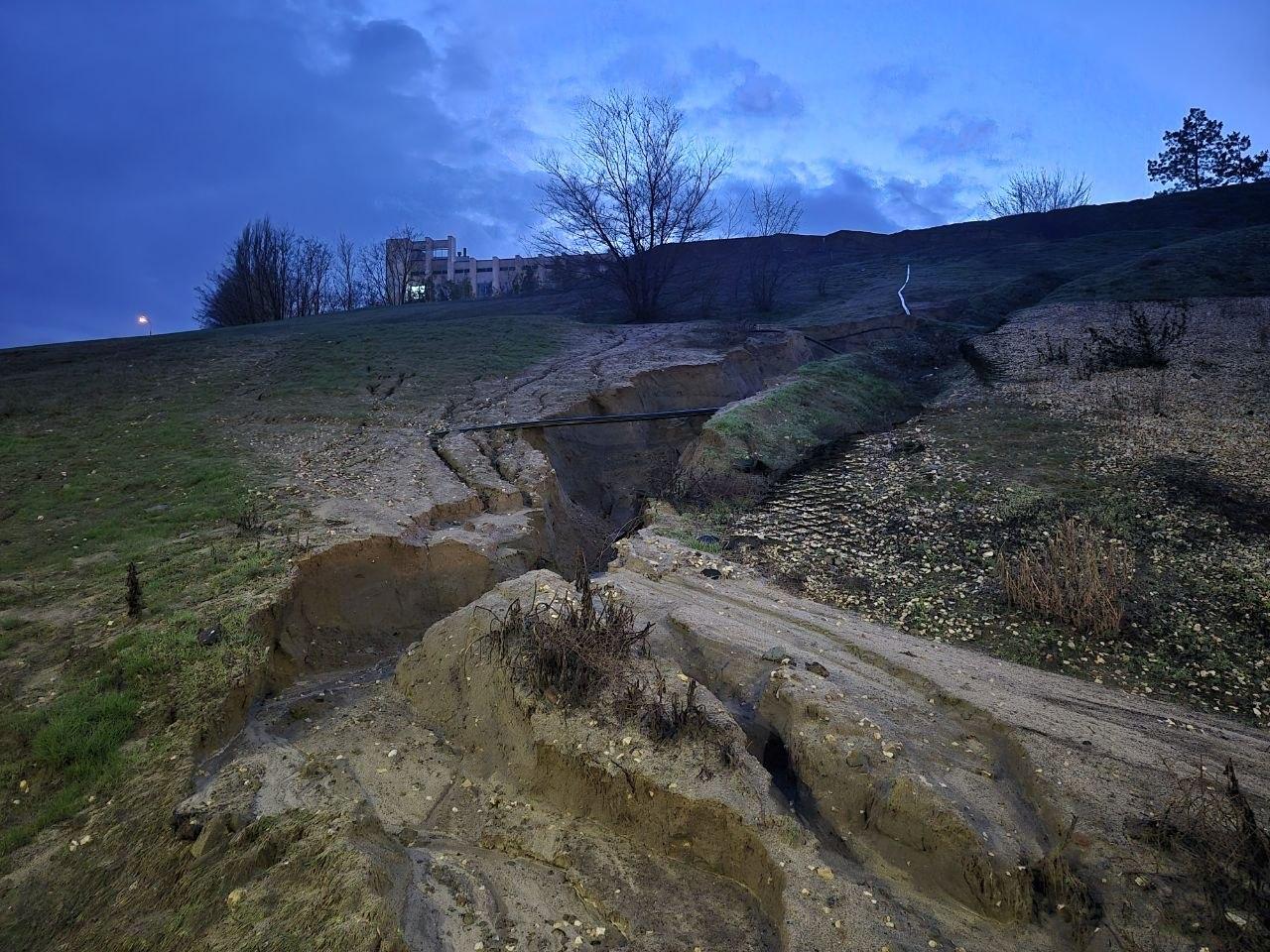 Крупная трещина на склоне у стадиона «Волгоград Арена», протянувшаяся к Первой Продольной магистрали.