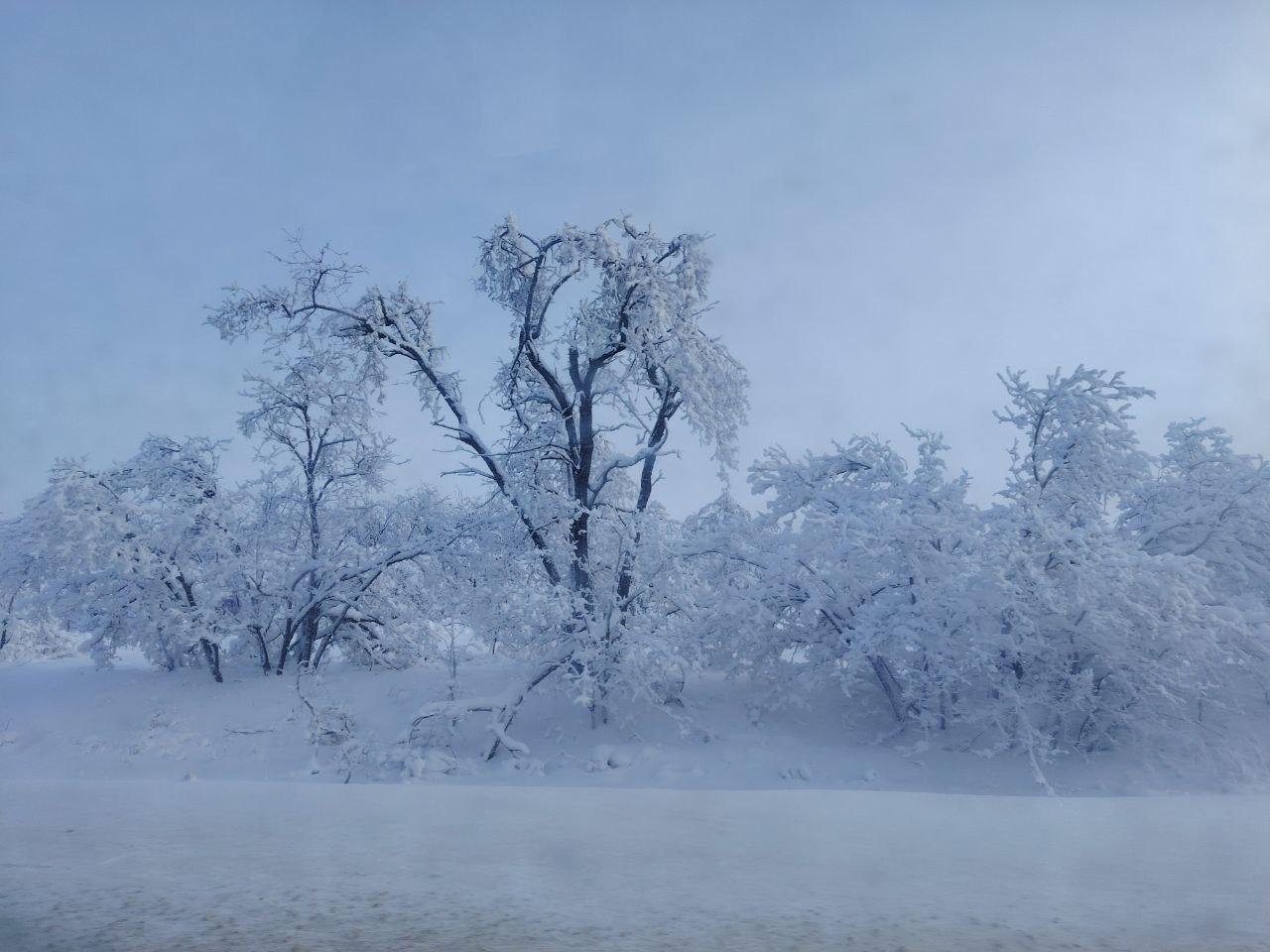 Деревья покрыты инеем, словно серебром.