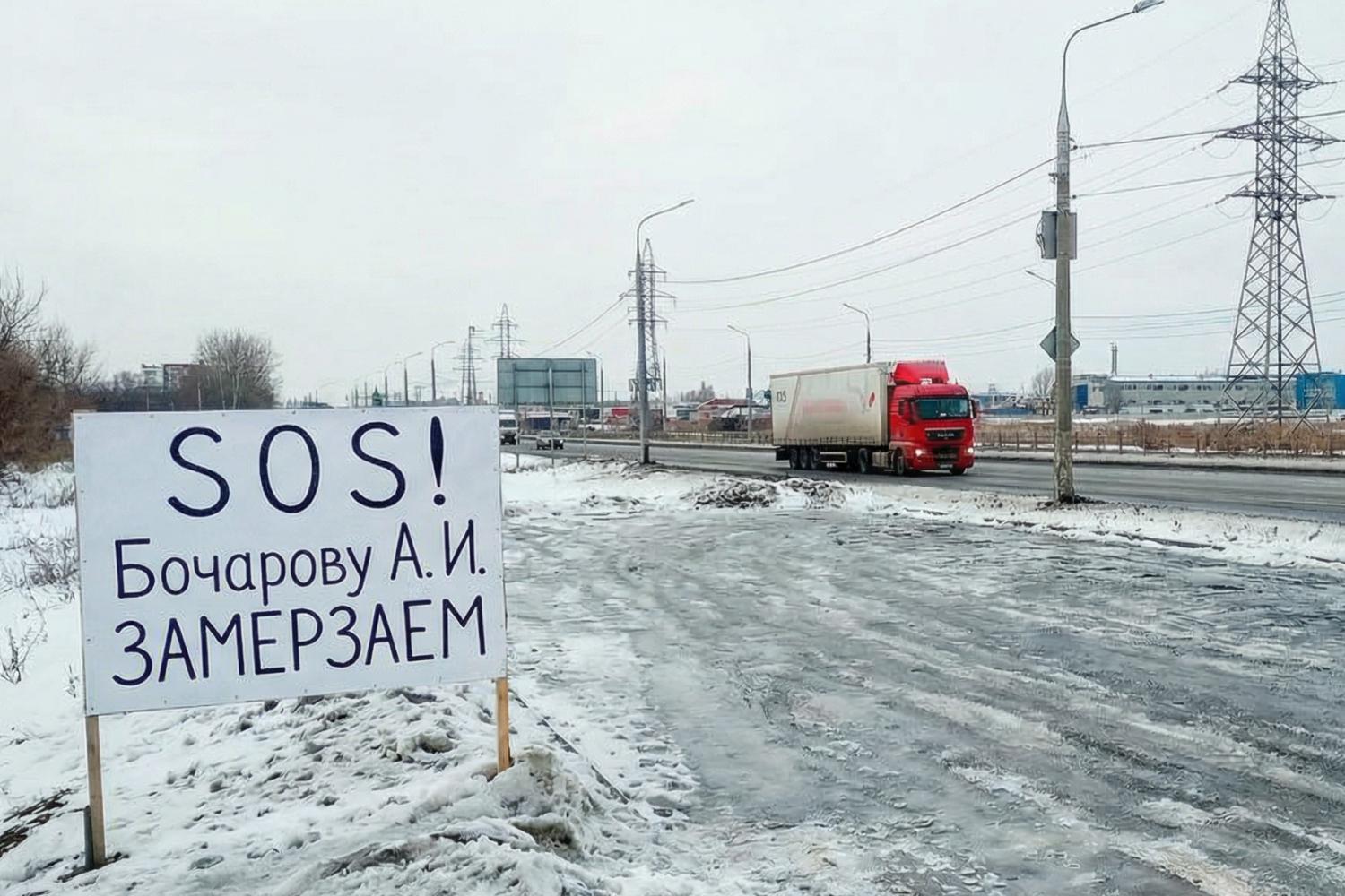 Баннер с текстом «SOS! Бочарову А. И. Лазоревая, 187. ЗАМЕРЗАЕМ» появился утром. Как рассказали горожане, отопление в их доме отключилось ещё 30 января. Обращения в управляющую компанию и Госжилинспекцию не приносили результата.