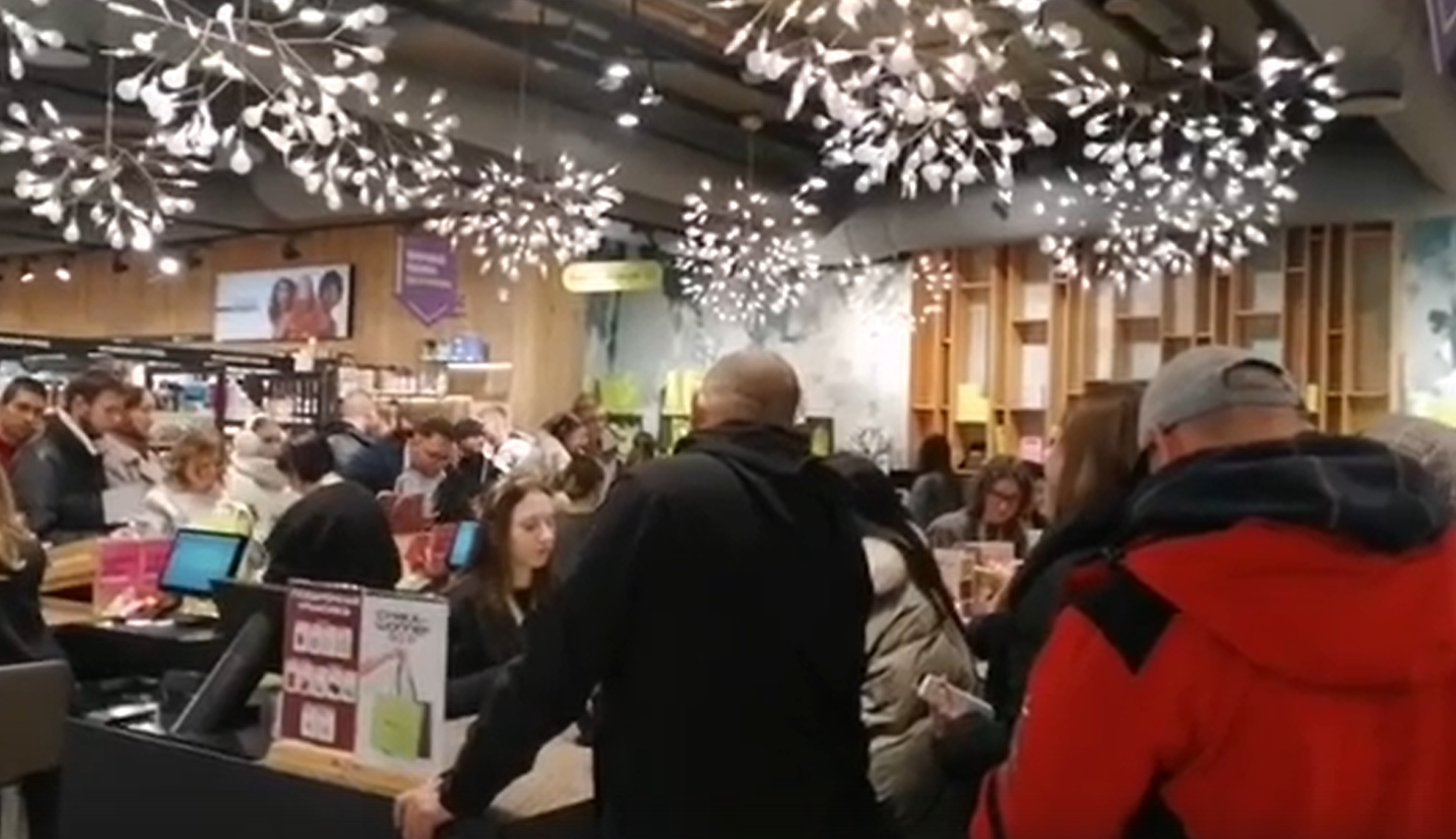 В преддверии Нового года в волгоградском магазине сети «Золотое яблоко» наблюдается небывалый наплыв покупателей. Многие приходят, чтобы выбрать подарки для себя и близких. Из-за огромного скопления людей некоторые посетители чувствуют себя плохо, а один человек едва не упал в обморок.