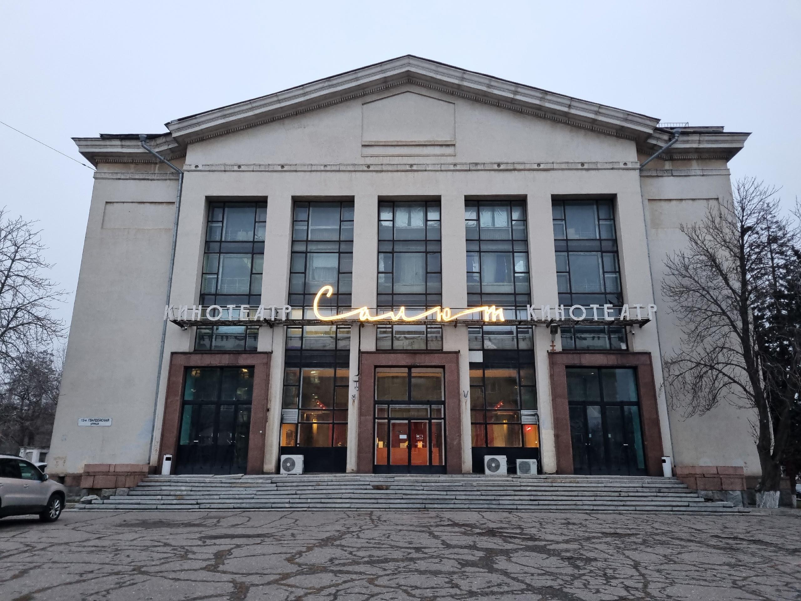 На фасаде бывшего кинотеатра «Салют» в центре Волгограда, примыкающего к Дому офицеров, вновь зажглась неоновая вывеска советских времён. Жители города долгое время видели её ржавой и неухоженной, но теперь конструкция красиво подсвечена. Эксперты утверждают, что подобные «рукописные» вывески сейчас встречаются крайне редко.