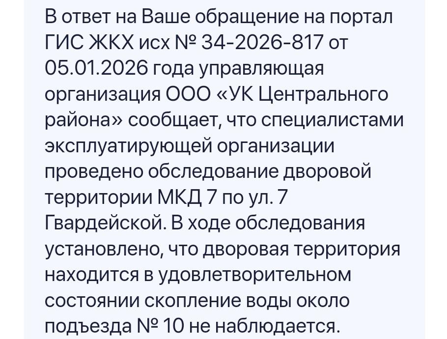 После жалобы управляющая компания направила на место сотрудников эксплуатирующей организации. Однако, как сообщили позже заявителям, специалисты не обнаружили никакой лужи.