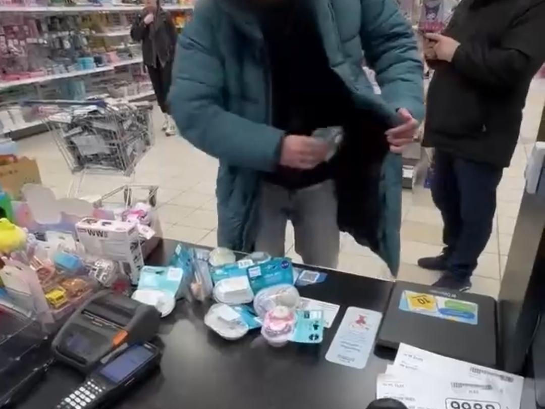 В одном из местных анонимных Telegram-каналов появилось видео, на котором запечатлено, как парень достает из карманов длинной куртки как минимум восемь сосок и складывает их перед работником магазина.