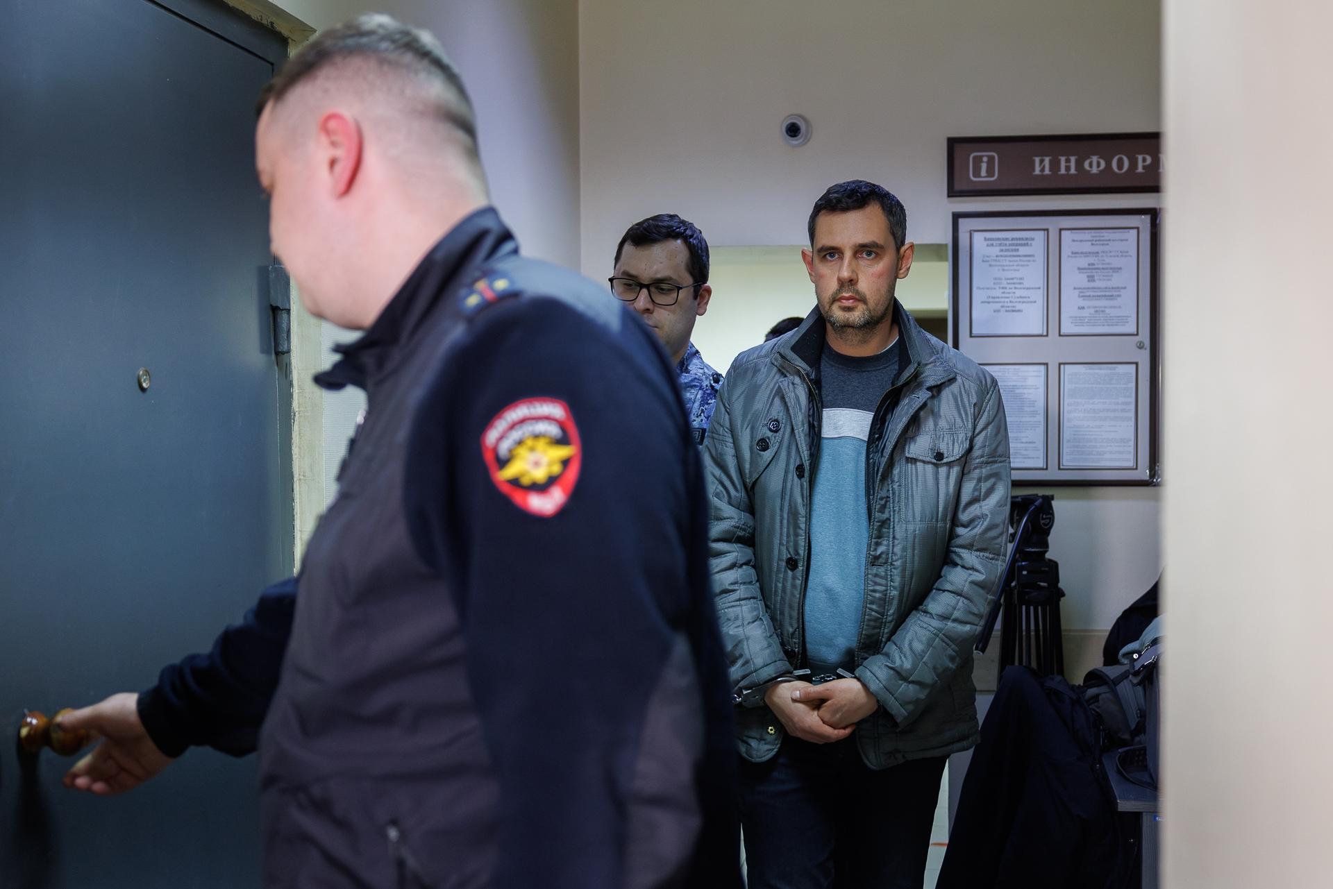 Следом в зал суда привели Виталия Кошелева. Его защитник Альберт Кармазиновский принёс грамоты и благодарственные письма от ГУ МВД России по Волгоградской области за участие Кошелева в полицейских акциях, надеясь повлиять на решение суда.