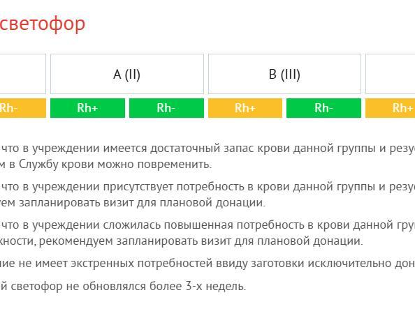 Данные о количестве крови размещаются на официальных онлайн-ресурсах центра. В еженедельном обновлении индикатора красным цветом отмечена четвертая группа крови с отрицательным резус-фактором. Этот сигнал не изменяется уже вторую неделю. Желтым цветом обозначена потребность в четвертой положительной, третьей положительной и первой отрицательной группах крови.
