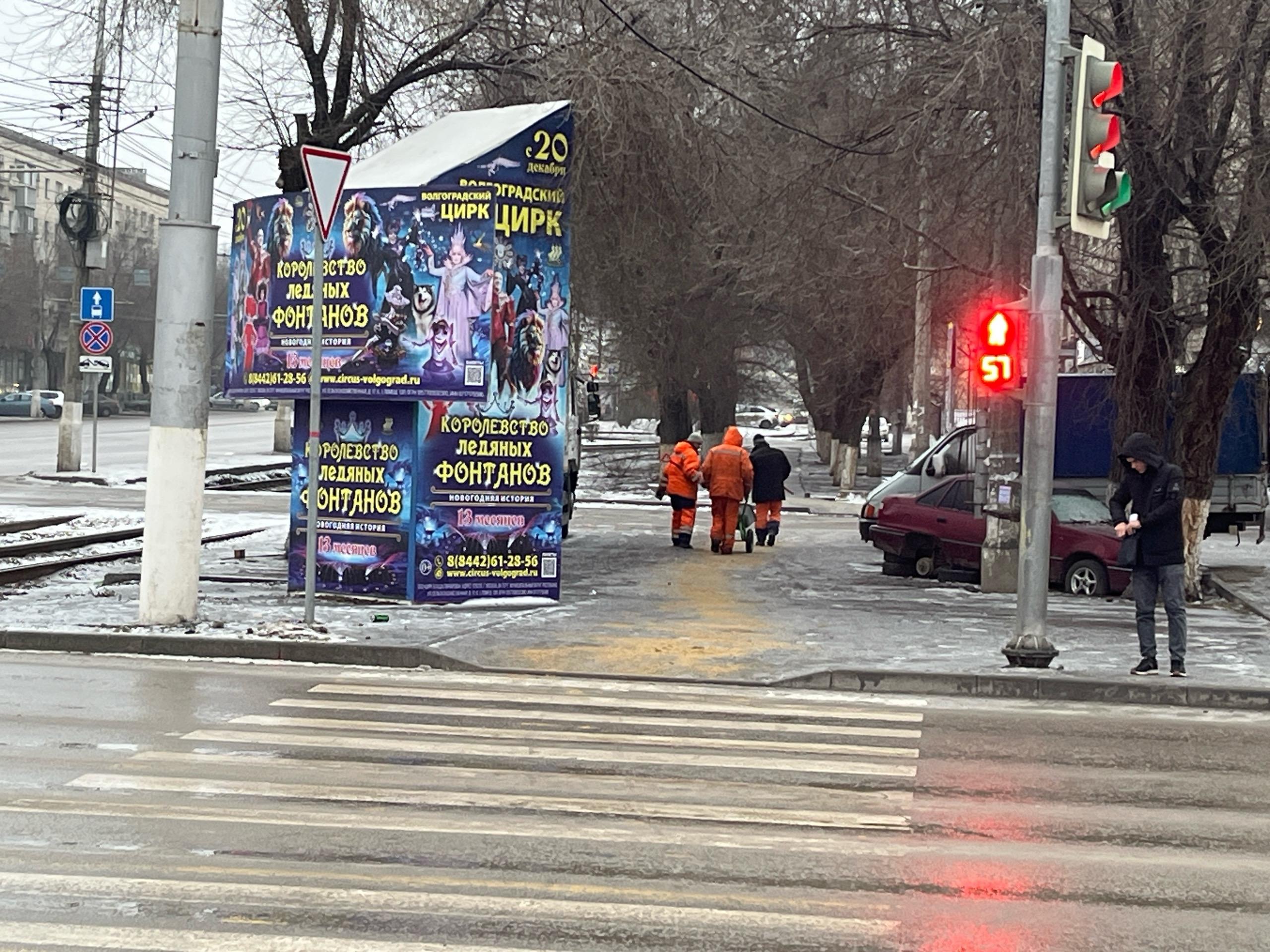 На второй день после образования сильного гололеда в Волгограде на улицах появились бригады коммунальных служб. Работники в ярких желтых жилетах, используя тачки и лопаты, рассыпали песок на пешеходных дорожках с наиболее интенсивным движением. Цвет песка почти сливался с их формой.