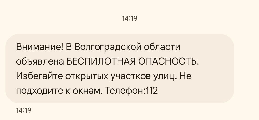 В тексте сообщения сказано: «Внимание! В Волгоградской области объявлена беспилотная опасность, — говорится в сообщении. — Избегайте открытых участков улиц, не подходите к окнам. Телефон: 112».