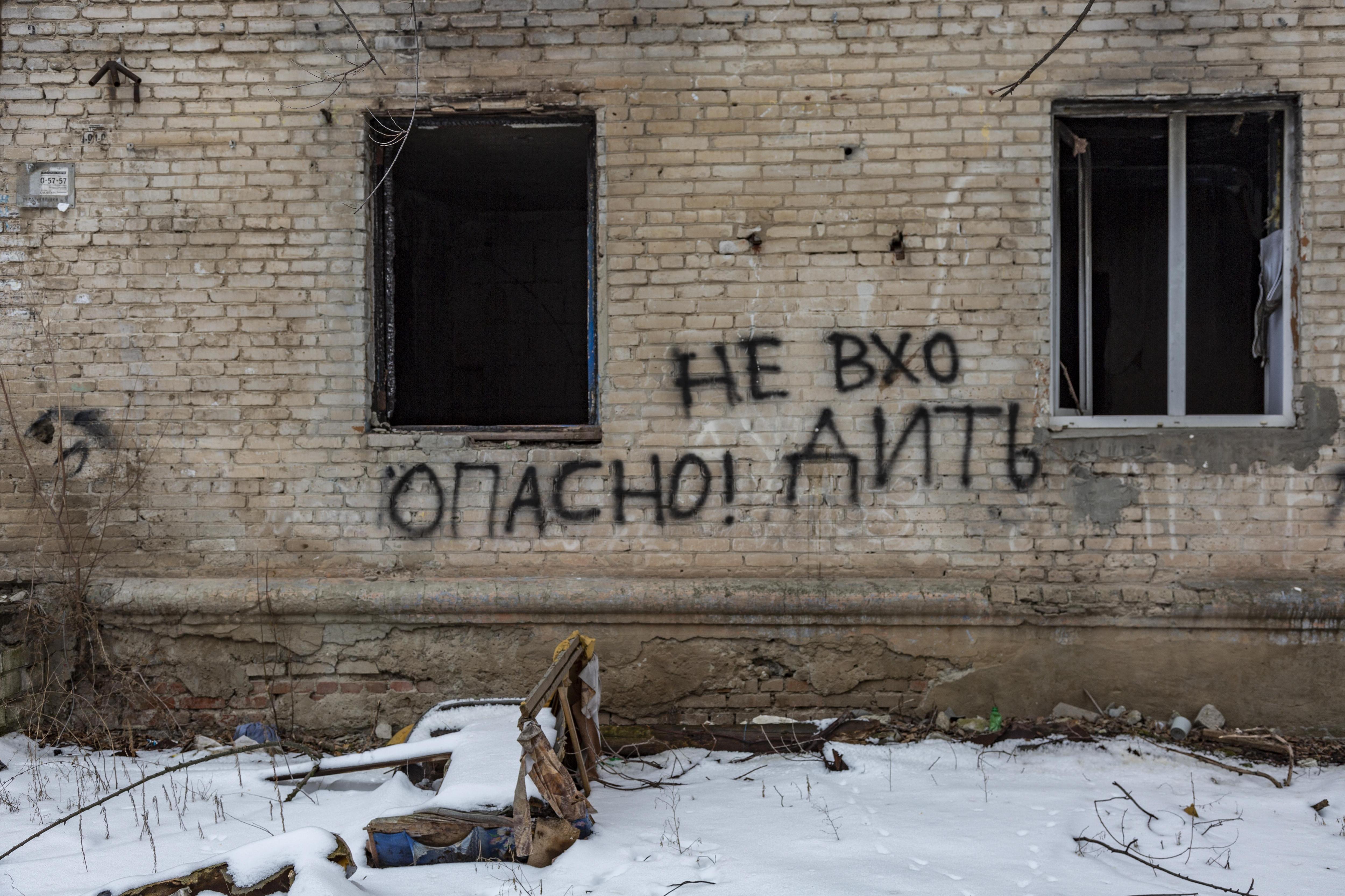 Вход в здание преграждает предупреждение об опасности, так как помещения разграблены, замусорены и неоднократно горели.