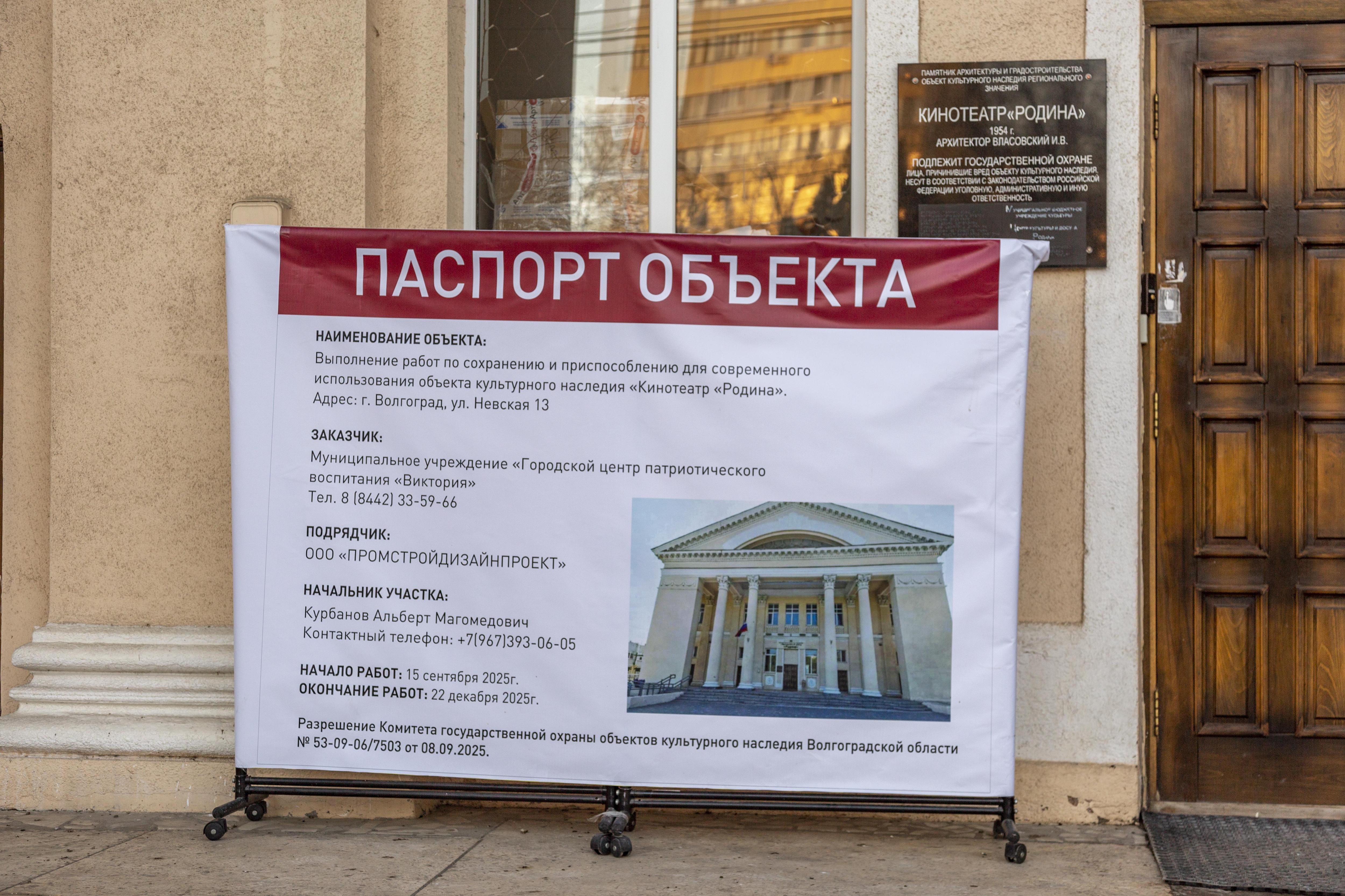 В мэрии Волгограда сообщили: «В августе текущего года МУ «Городской центр патриотического воспитания «Виктория» заключил контракт с ООО «Промстройдизайнпроект» на выполнение работ по сохранению и приспособлению для современного использования объекта культурного наследия «Кинотеатр «Родина» со сроком выполнения работ — до 22 декабря 2025, — заявили в мэрии. — В сентябре подрядчик получил разрешение на проведение работ от комитета государственной охраны объектов культурного наследия Волгоградской области и приступил к исполнению контракта. В декабре контракт с подрядной организацией был расторгнут в связи с ненадлежащим исполнением обязательств. Также УФАС было принято решение о внесении ООО «Промстройдизайнпроект» в реестр недобросовестных поставщиков, подрядчиков и исполнителей.»