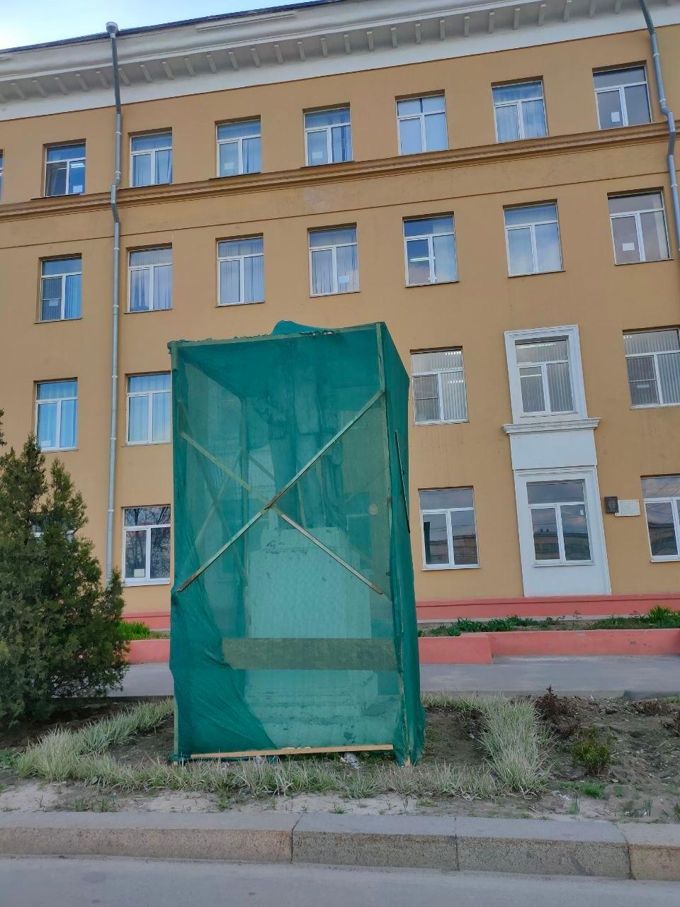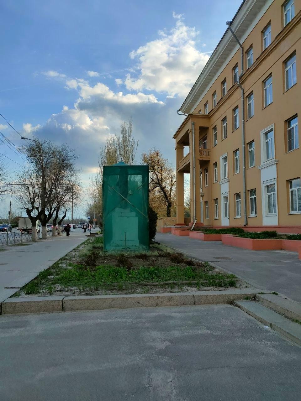 В Волгограде спрятали под сеткой разваливающийся памятник Калинину