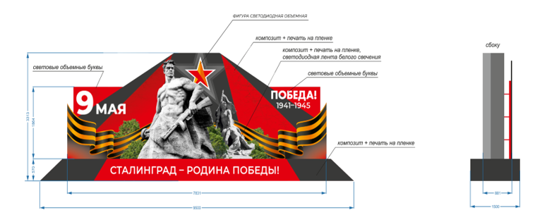 Из опубликованных документов госзакупки следует, что конструкция будет металлической. Её поверхность покроют самоклеящейся плёнкой с патриотическим изображением. Надписи «9 мая» и «Победа! 1941-1945» планируется сделать объёмными, а для подсветки использовать светодиодную ленту. Подрядчик обязан завершить все работы и сдать объект не позднее 7 мая.