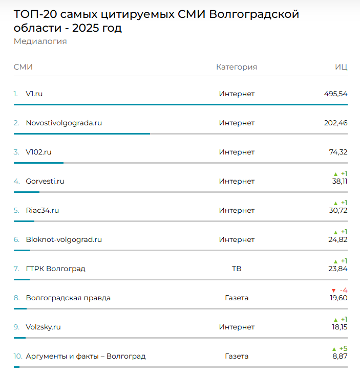 V1.RU сохранил лидерство по сравнению с 2024 годом, когда также возглавлял данный рейтинг. В прошлом году пятёрку замыкал «Блокнот Волгограда», который в 2025-м опустился на одну позицию.
