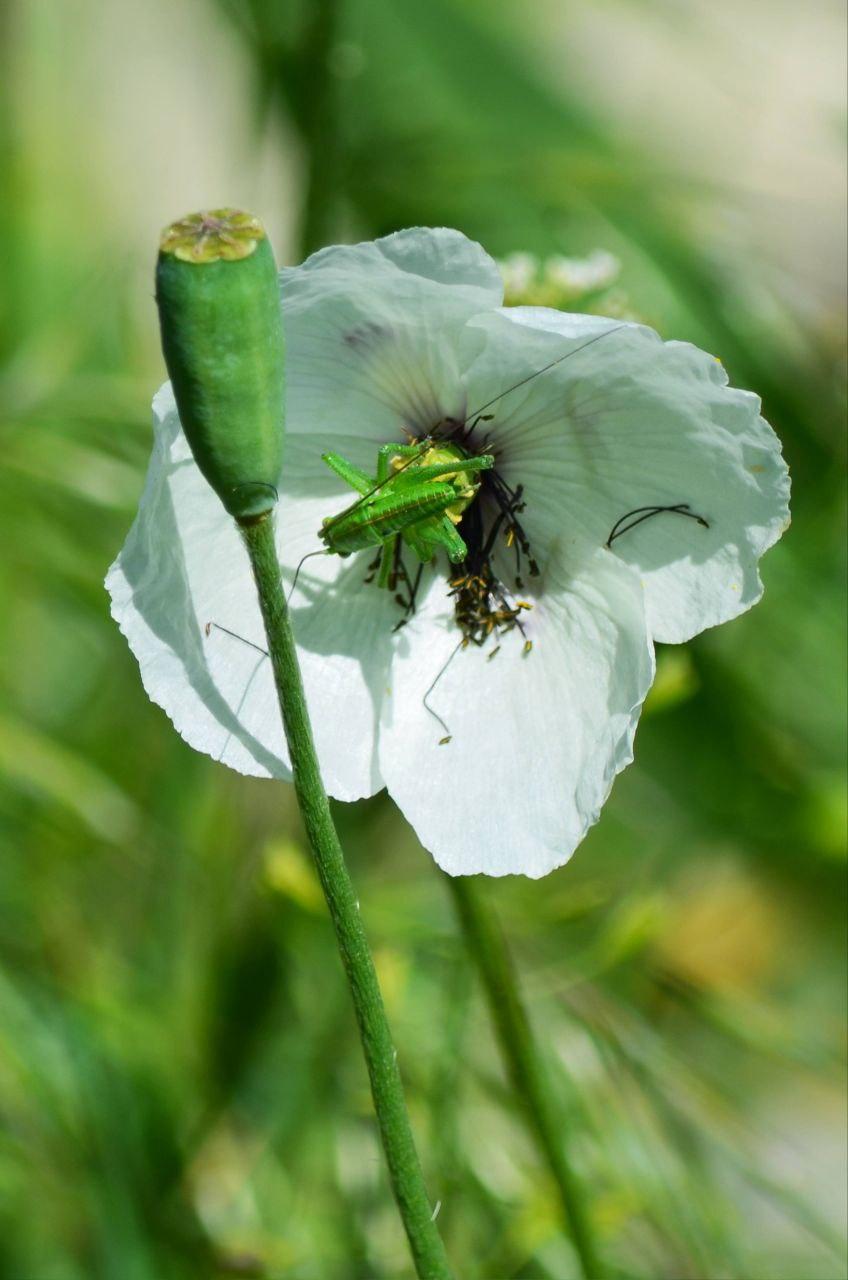 Неожиданный обитатель среди цветов — кузнечик.