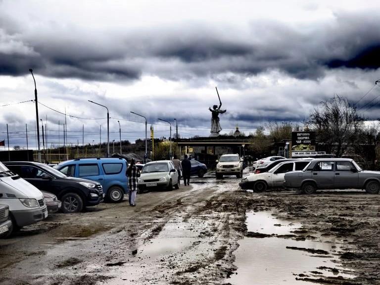 Затопленная парковка у подножия Мамаева кургана после сильного ливня.