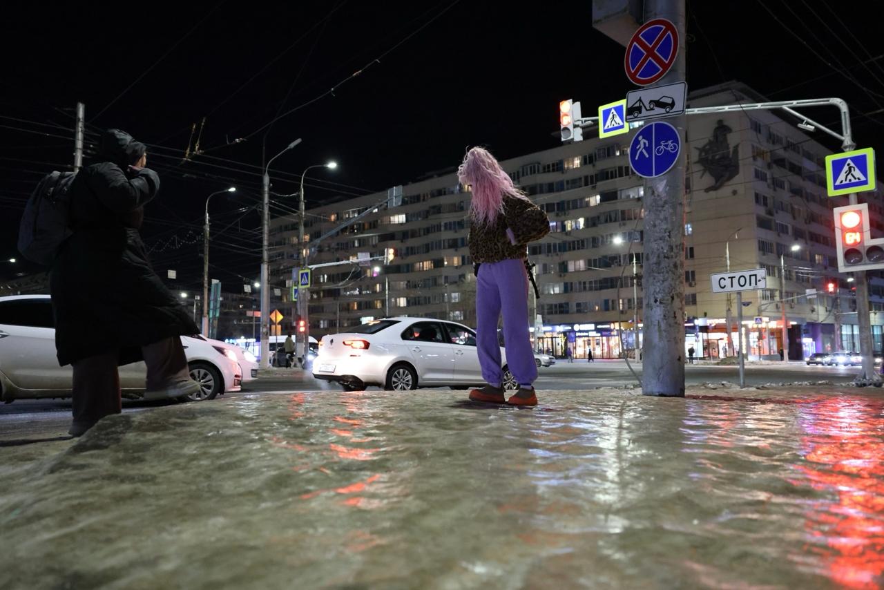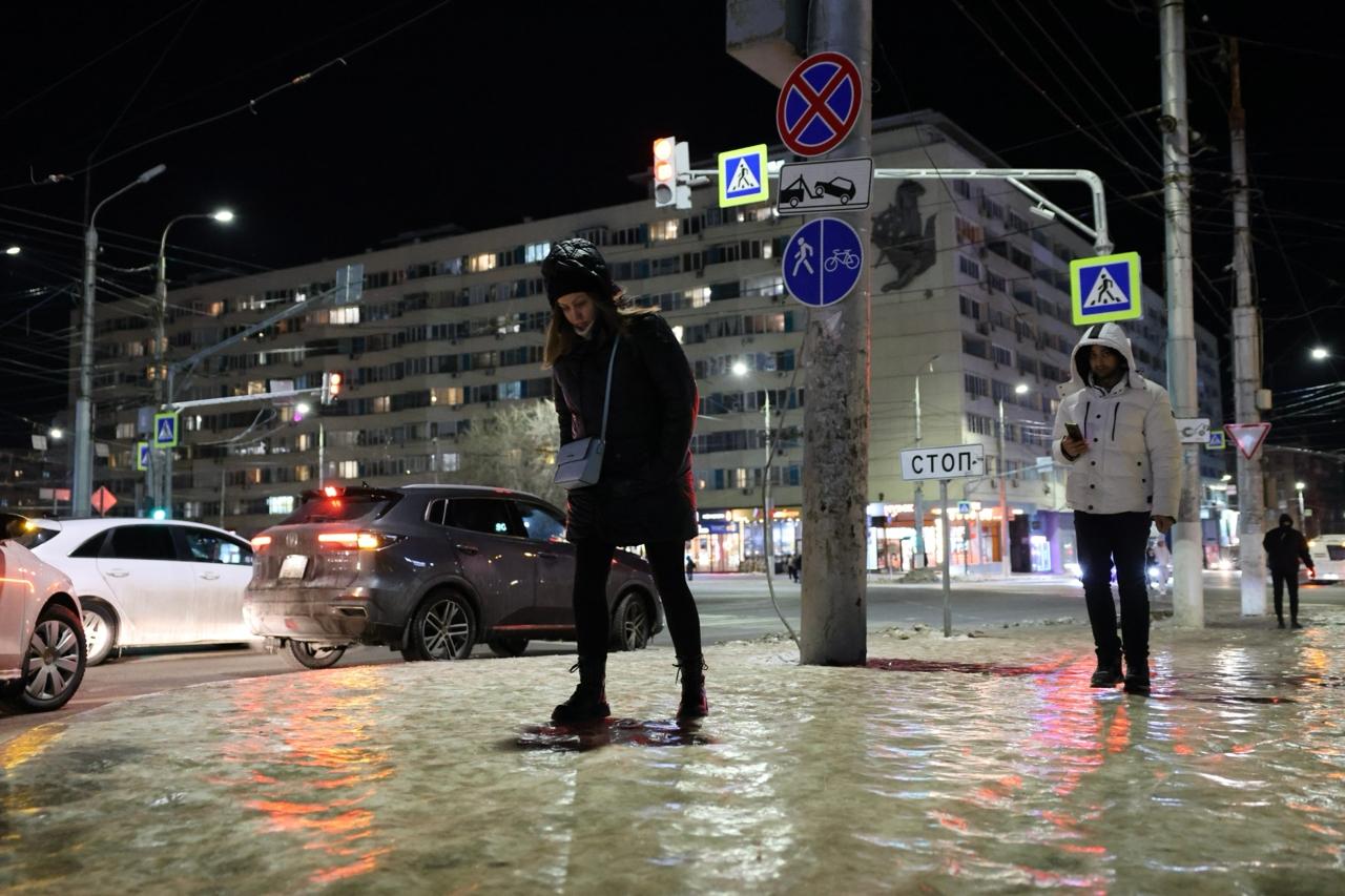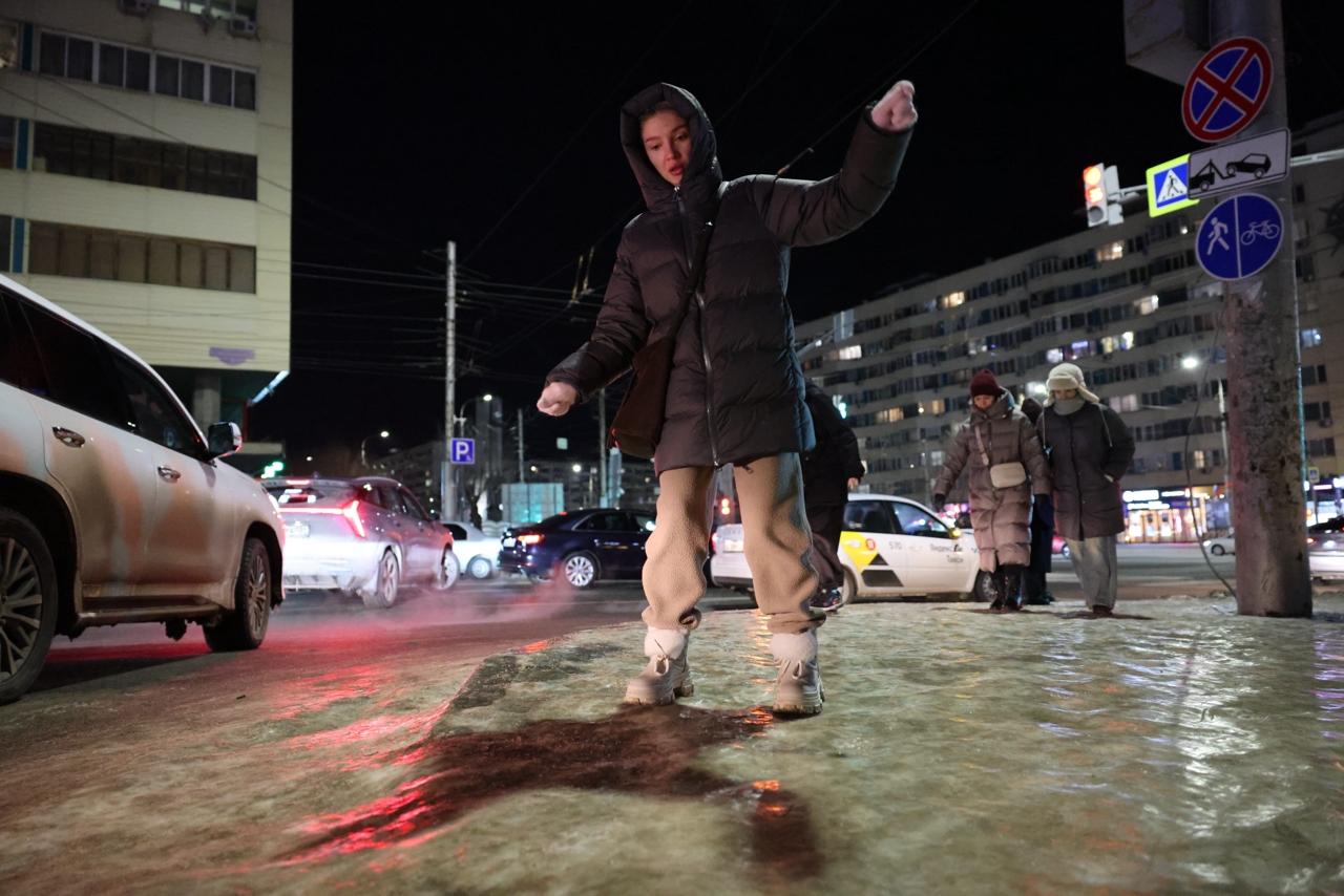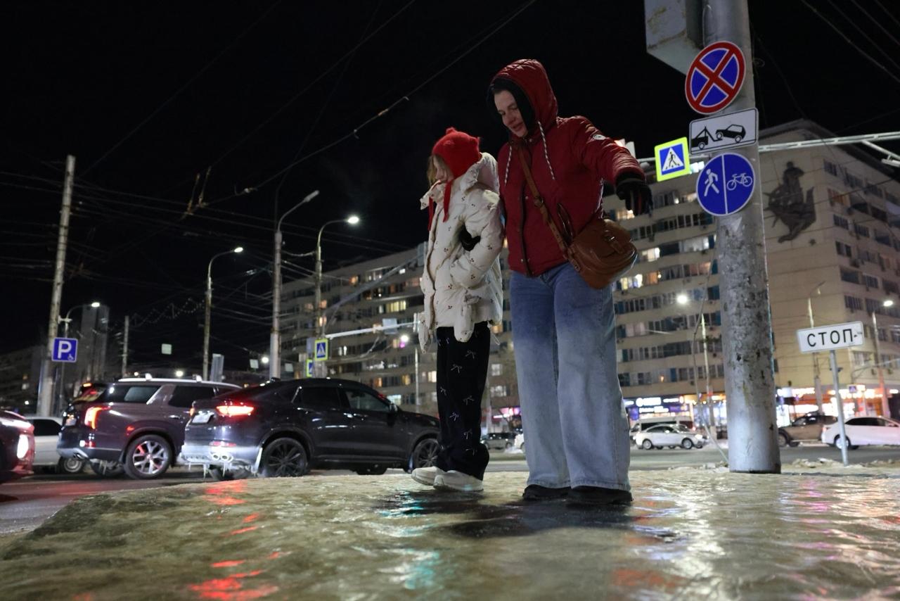 После дождя, прошедшего в Волгограде 8 февраля после полудня, на улицах образовался плотный слой льда. Синоптики ранее предупреждали об этих осадках.
