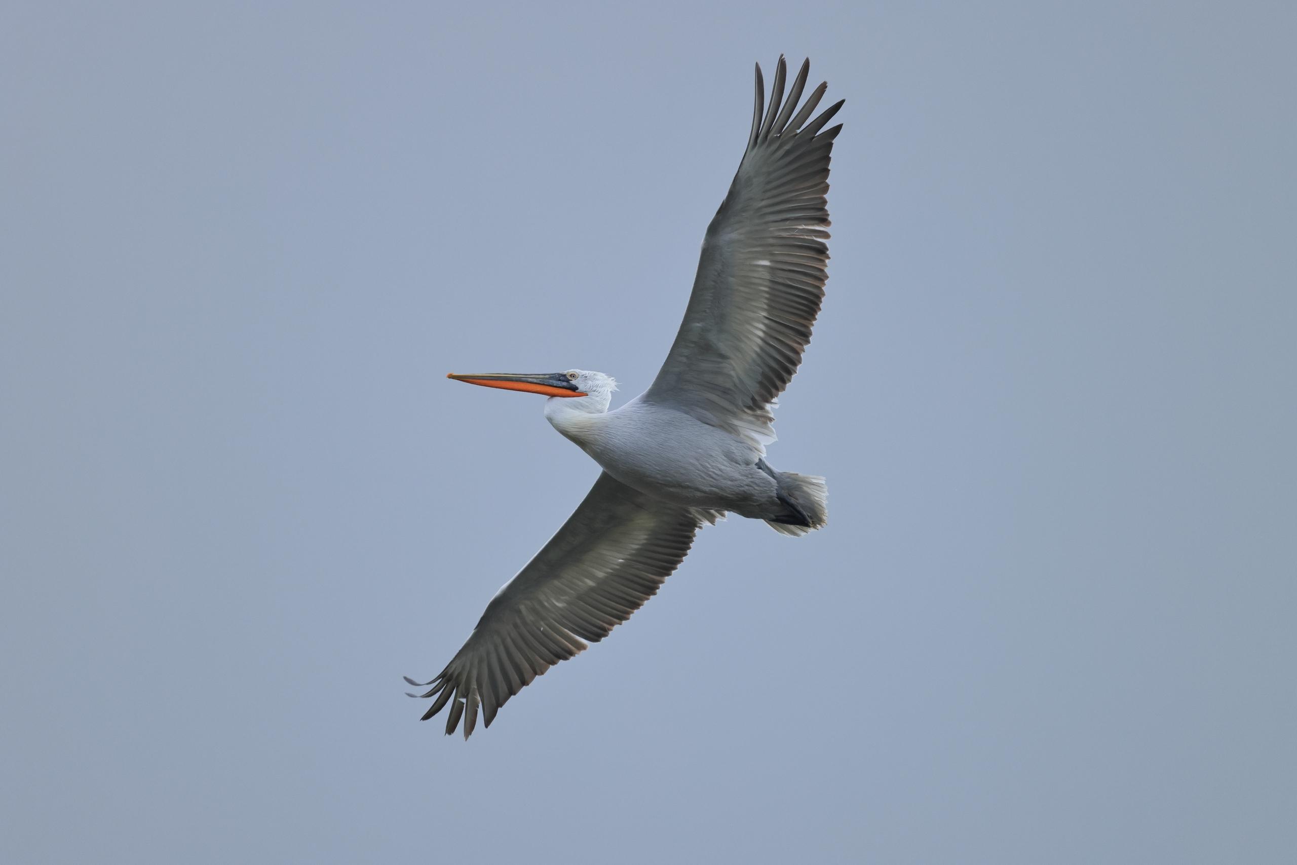 Кудрявый пеликан в полете
