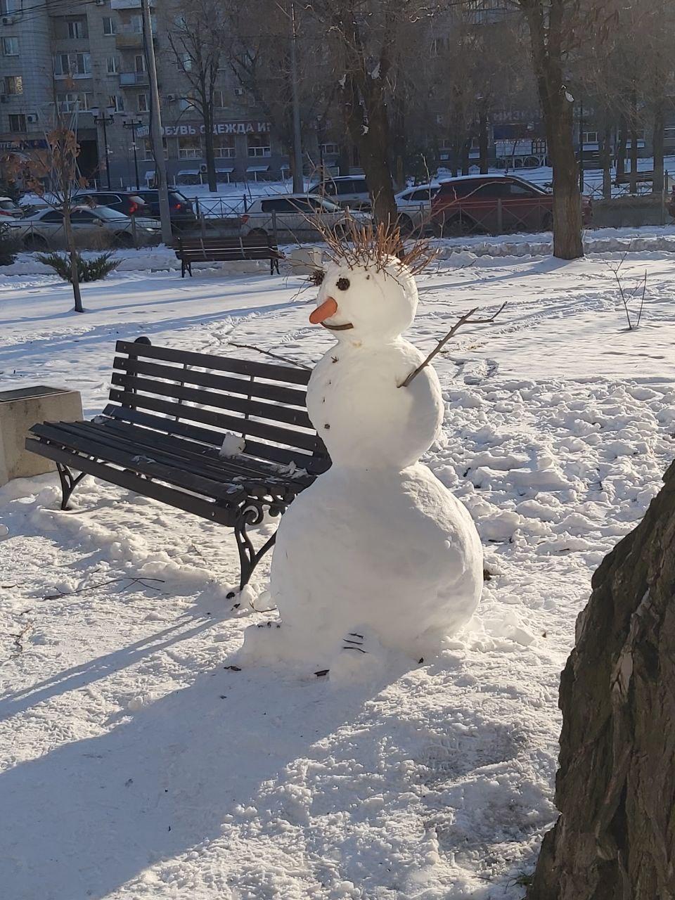 Кто-то из горожан уже успел слепить снеговика.