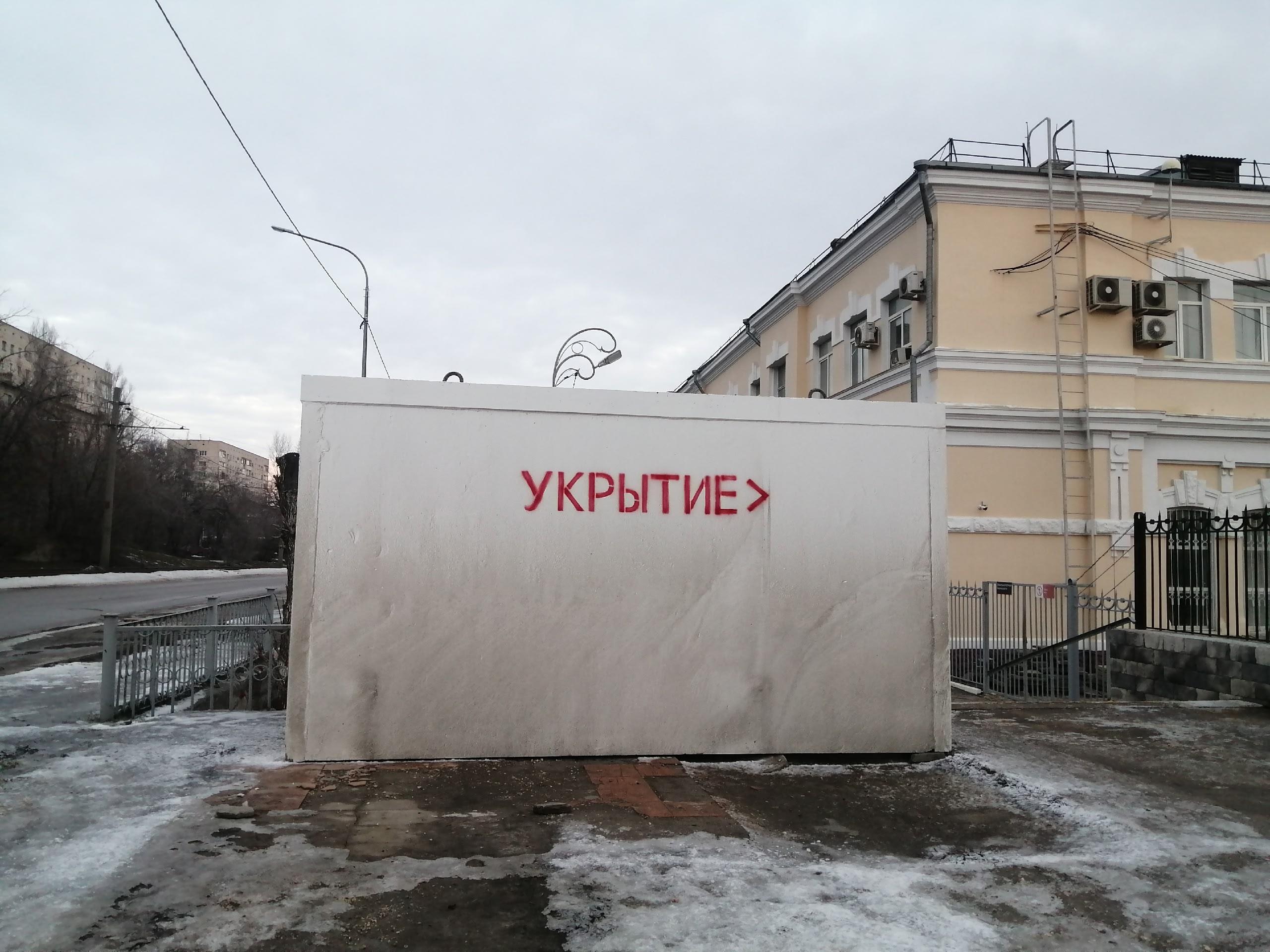 Один из таких бетонных блоков установлен возле вокзала Волгоград-2. Его покрасили белой краской, которая быстро покрылась грязью и потеками. На боках видна ярко-красная надпись «Укрытие». Площадь конструкции оценивается от шести до девяти квадратных метров. Железобетонный короб размещён у привокзальной парковки. Он не огорожен забором, и войти в него можно свободно.